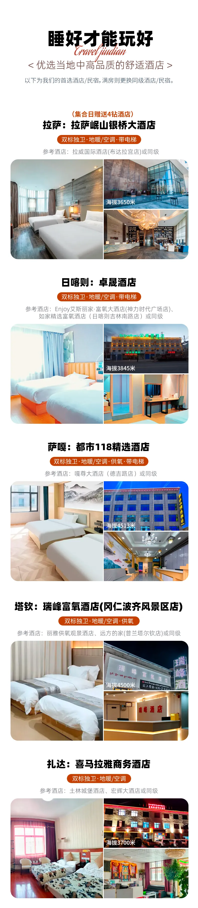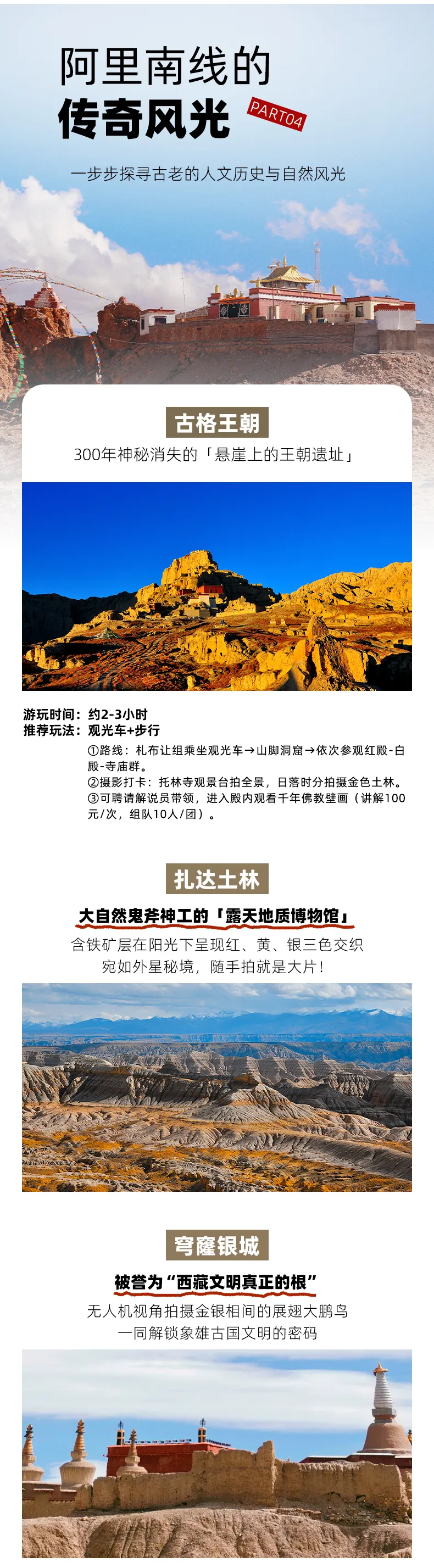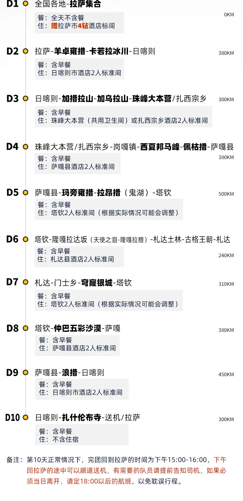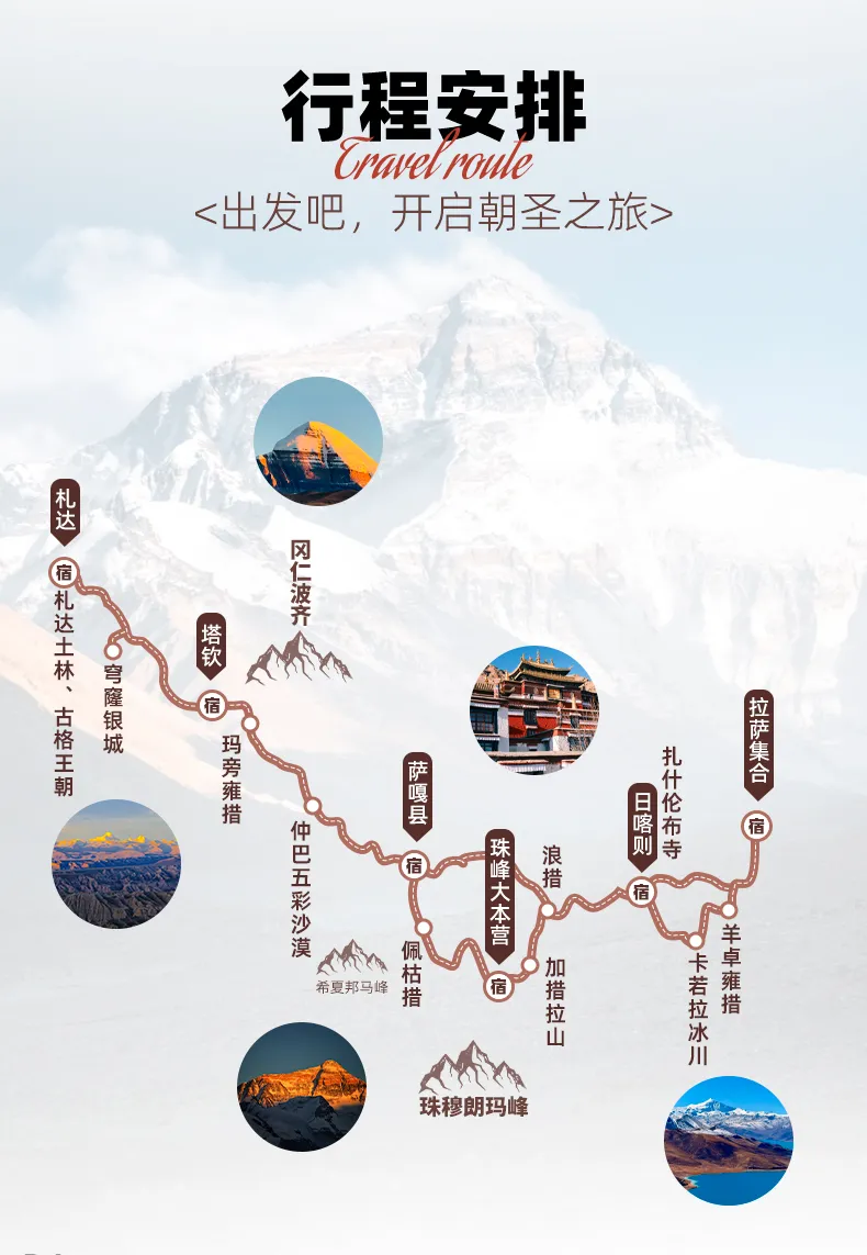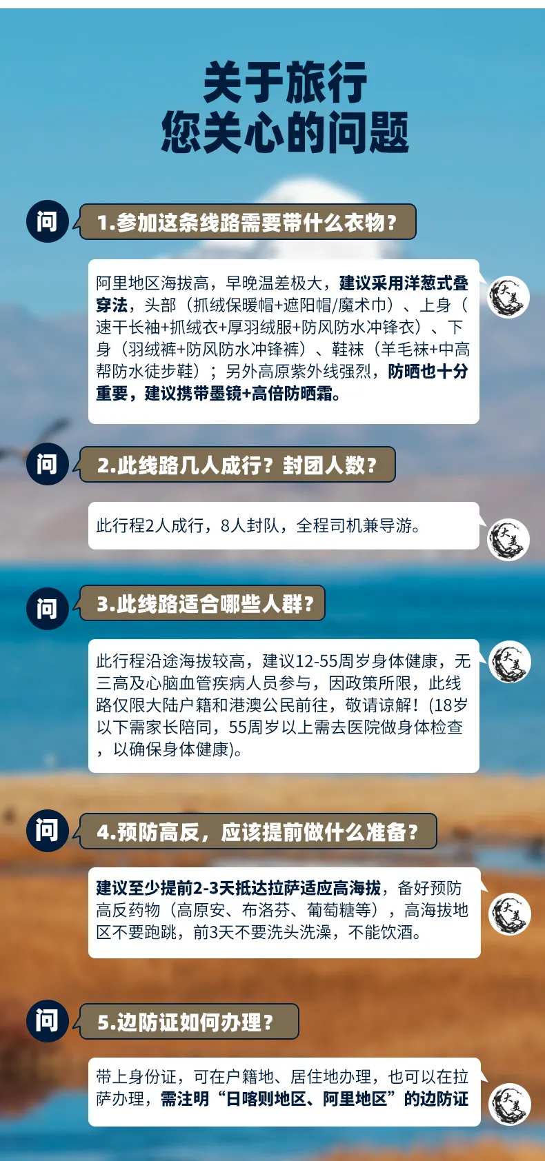 此条线路全程平均海拔在4000以上,对身体要求较高,最好之前来西藏旅游过。阿里地区条件有限,住宿条件有限,行程艰苦,请做好心理准备!