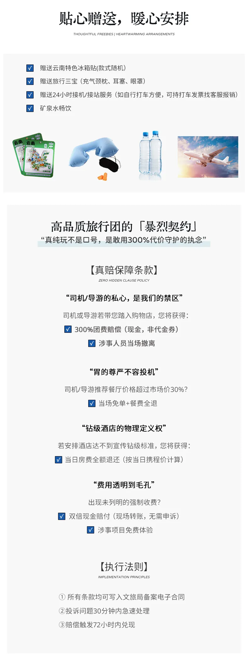 10、行程中的赠送项目,如因交通、天气等不可抗因素导致不能赠送的、或因您个人原因不能参观的,费用不退,敬请谅解。