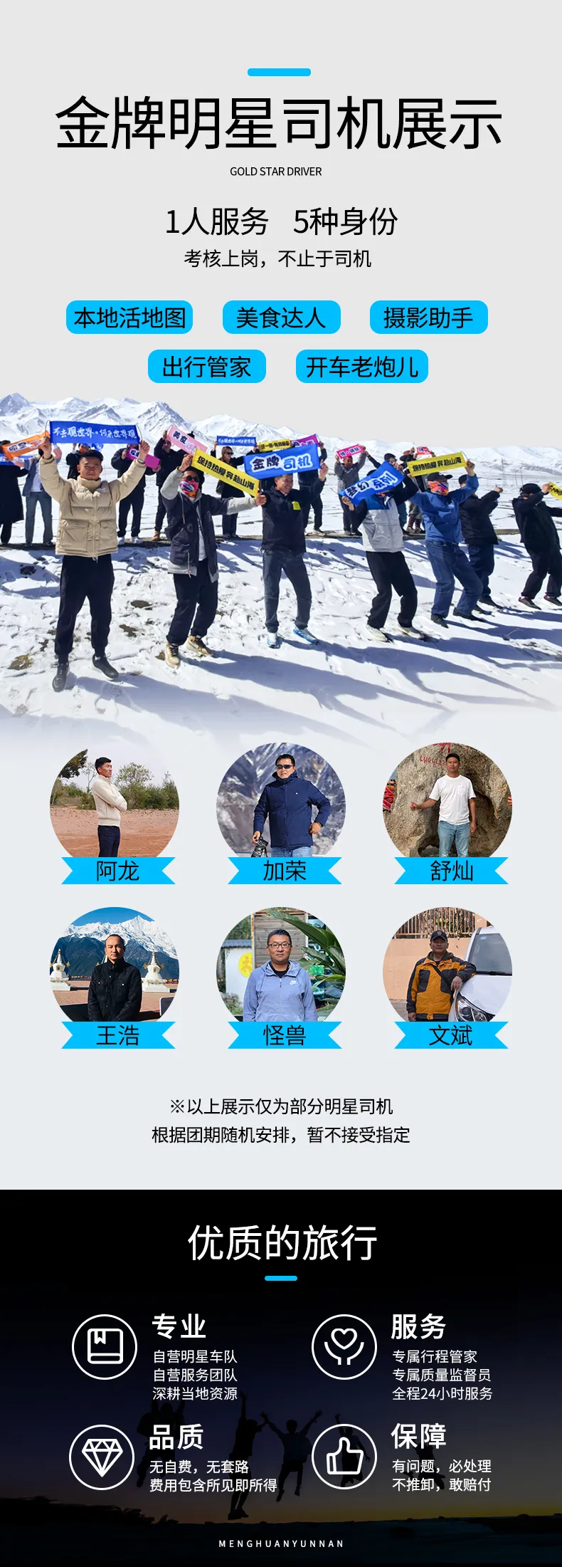 13、行程中司机、领队等工作人员拍摄的照片或者视频有可能会用于我司宣传线路之用,无其他用途;如您介意可联系我司第一时间删除,保证您的权益。
