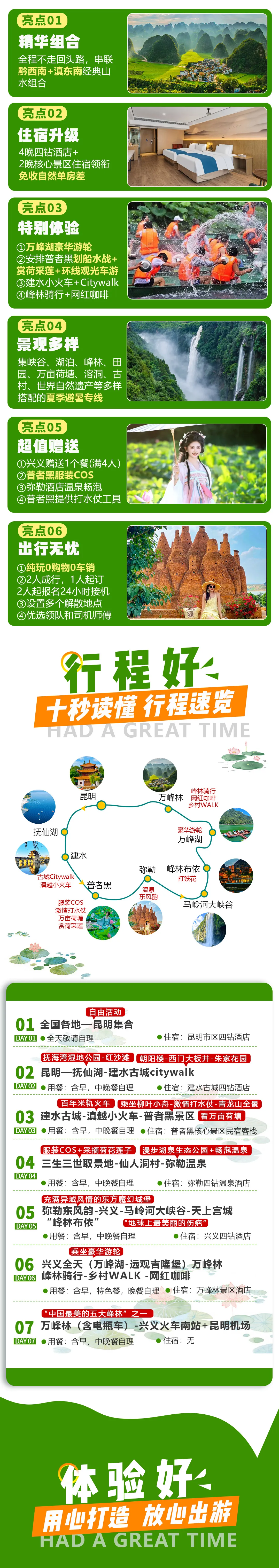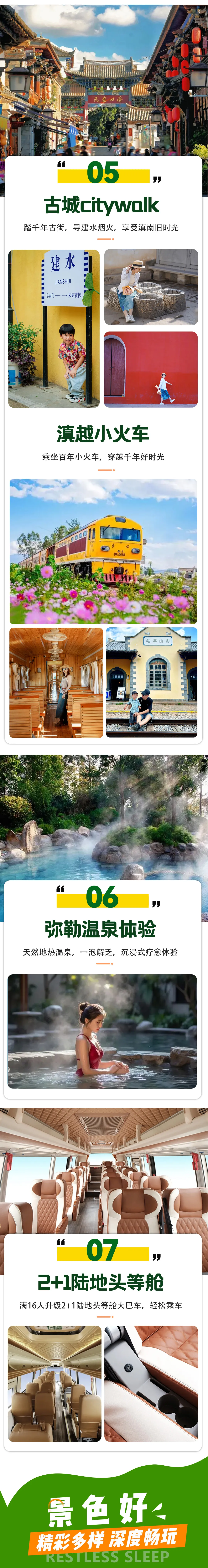 2、云南海拔梯度较大:其中昆明海拔约1895米,大理约1976米,丽江约2410米,泸沽湖约2690米,香格里拉县约3280米,西双版纳约1700米,腾冲约1640米;梅里群峰最高海拔6740米,为云南最高点;河口县海拔仅76.4米,为云南省最低点;另省内旅游区域间距离较长,各地昼夜温差较大,敬请提前做好准备,自备晕车药、衣物、雨具、防晒霜等;有高血压、心脏病或其他病史情况的游客请主动告知,以便工作人员针对性安排或给出相关忠告,因客人隐瞒、虚报或其他个人因素引发的问题我社概不负责!