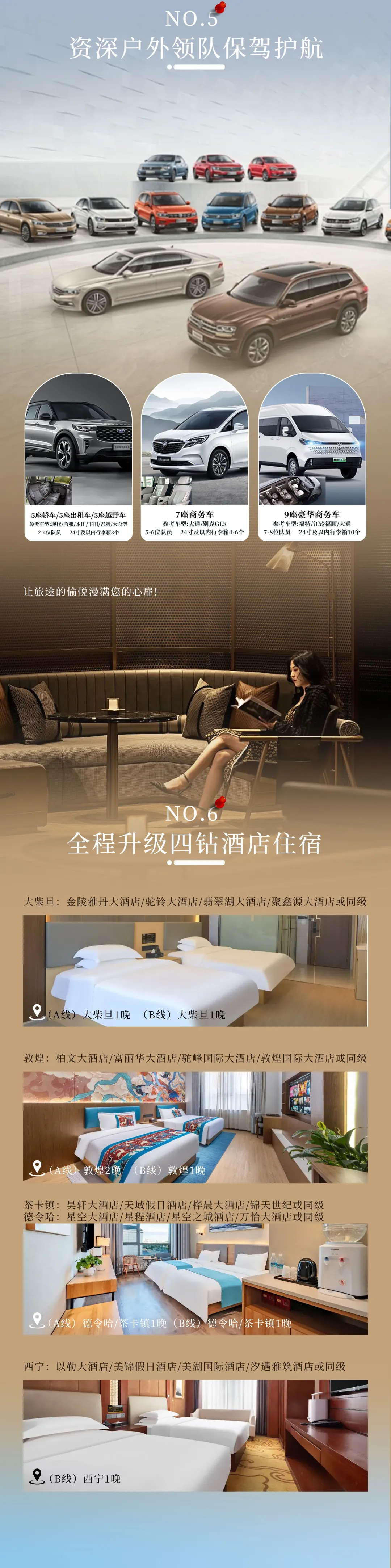 · 傍晚:抵达【大柴旦镇】入住。这里是重要的补给点,海拔约3100米,注意避免剧烈运动。