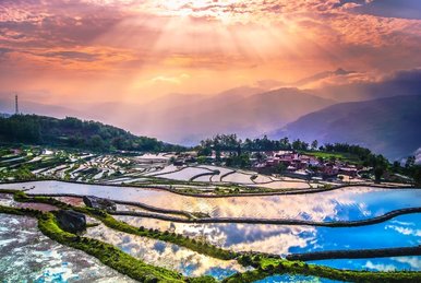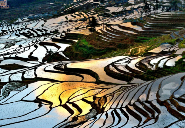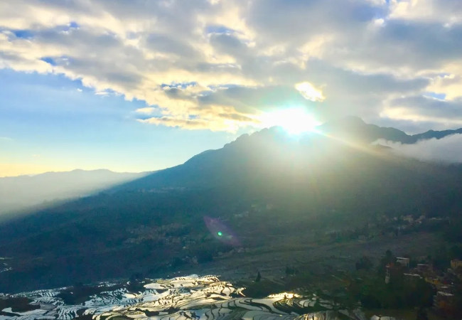 然后一路向南,来到世界文化景观遗产【元阳梯田】坝达梯田观景台拍摄观赏日落,达梯田气势磅礴、面积广阔、立体感强!从海拔800米的麻栗村河起,依山而上3700多级梯田,棉不断廷伸至海拔2000多米的高山。如果能遇上了多云渐晴、睛渐多云,或雨后初晴,大家就可以真正的领略元阳梯田风云变幻、气吞山河的盛景。随着太阳下山,坝达梯田变幻着色彩,光影交加,不由得让人感叹天地的神奇。【坝达梯田】: 坝达景点是申报世界文化遗产核心保护之一、坝达梯田气势磅礴、面积广阔、立体感强、从海拔800米的麻栗村河起、依山而上、3700多级梯田棉不断、廷伸至海拔2000多米的高山。