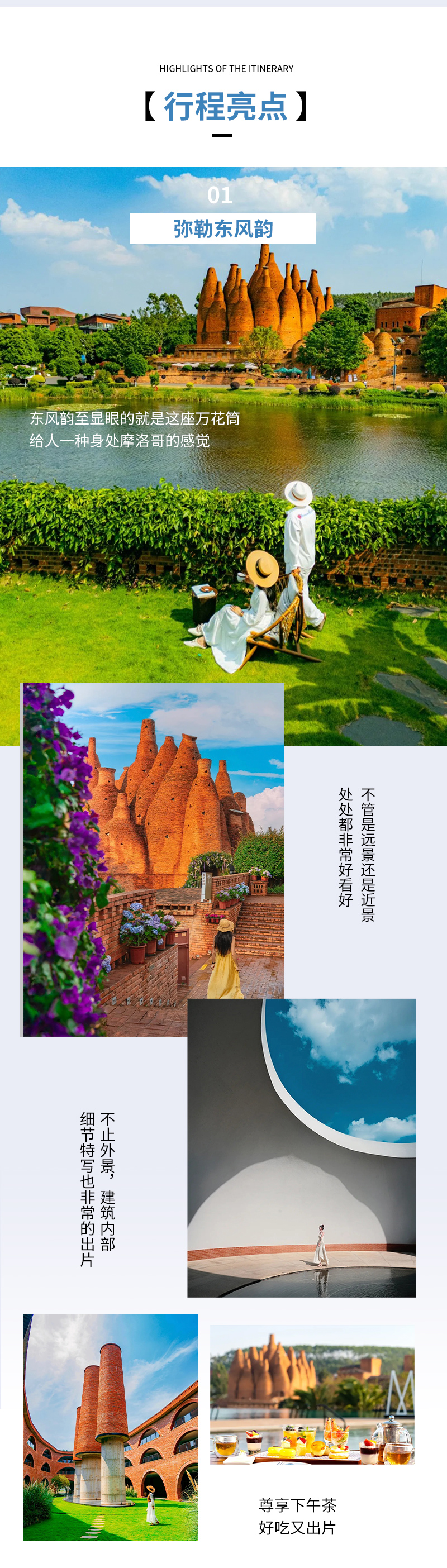 适时前往【东风韵】是位于弥勒的小众艺术小镇,这里有葡萄园、薰衣草地和大批后现代建筑。这里是私藏的神仙宝地,新晋网红打卡地,红砖堆砌出的异形建筑物充满了异域特色,仿佛置身遥远的神秘国度。 奢享贵宾专属的下午茶,享受属于您的滇东南小资时刻;