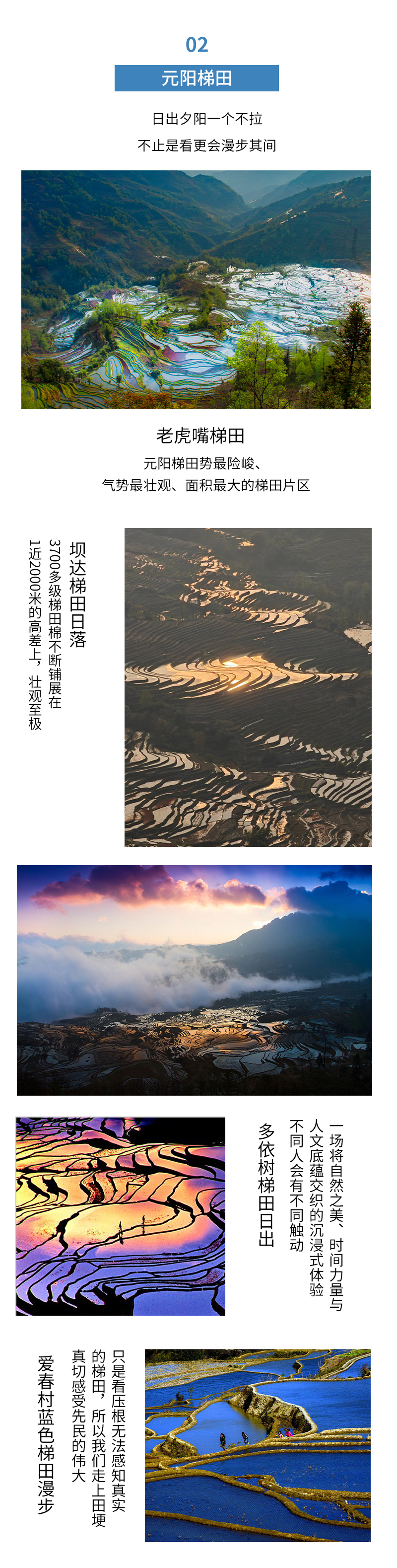 然后一路向南,来到世界文化景观遗产【元阳梯田】坝达梯田观景台拍摄观赏日落,达梯田气势磅礴、面积广阔、立体感强!从海拔800米的麻栗村河起,依山而上3700多级梯田,棉不断廷伸至海拔2000多米的高山。如果能遇上了多云渐晴、睛渐多云,或雨后初晴,大家就可以真正的领略元阳梯田风云变幻、气吞山河的盛景。随着太阳下山,坝达梯田变幻着色彩,光影交加,不由得让人感叹天地的神奇。【坝达梯田】: 坝达景点是申报世界文化遗产核心保护之一、坝达梯田气势磅礴、面积广阔、立体感强、从海拔800米的麻栗村河起、依山而上、3700多级梯田棉不断、廷伸至海拔2000多米的高山。