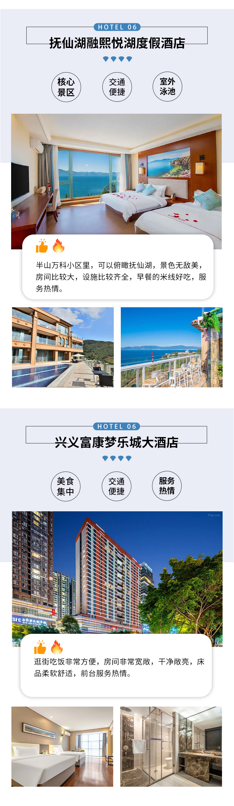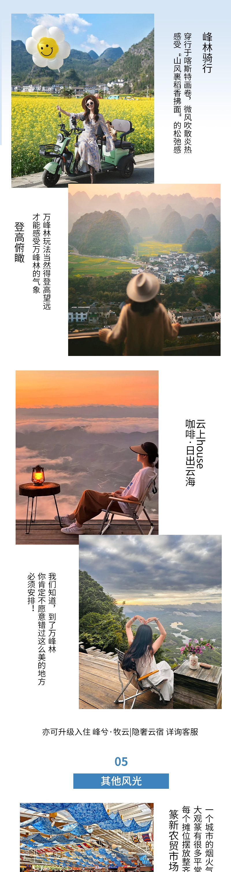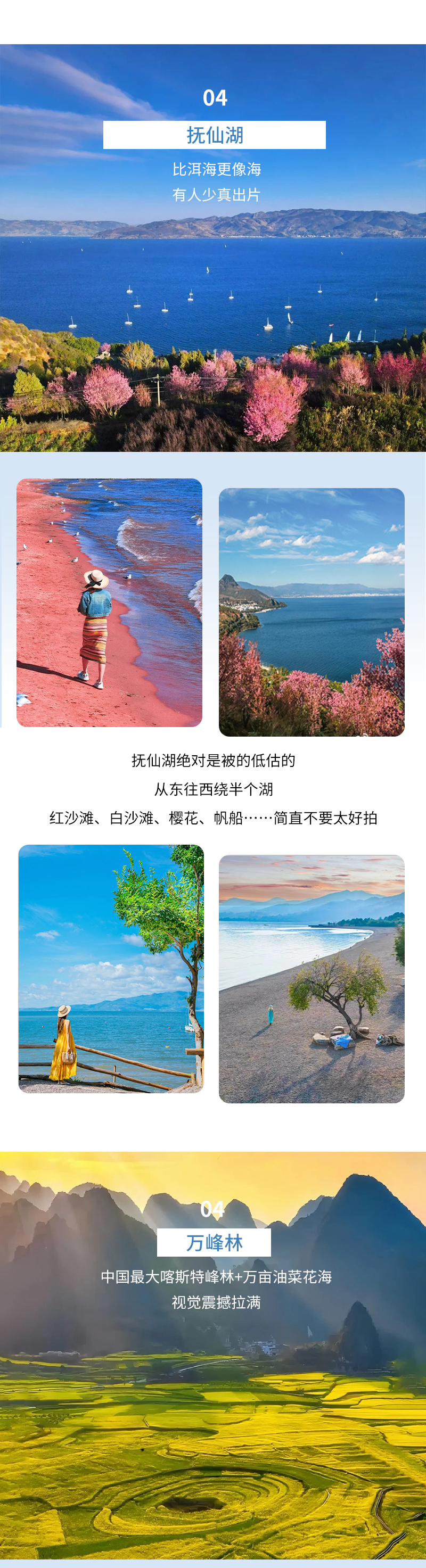 【7日行程】早餐以后,我们从抚仙湖畔的【樱花谷】出发。此刻的湖面平滑如镜,倒映着远山与初开的云霞,湖畔的樱花树静静伫立(若逢花期,满树烂漫将更添诗意)。告别澄澈的抚仙湖,我们乘车前往万峰林。 沿途欣赏万亩罗平油菜花。下午游览【万峰林景区】,景区分为东峰林和西峰林,以徐霞客诗句“天下山峰何其多,惟有此处峰成林”著称。晚上入住兴义
