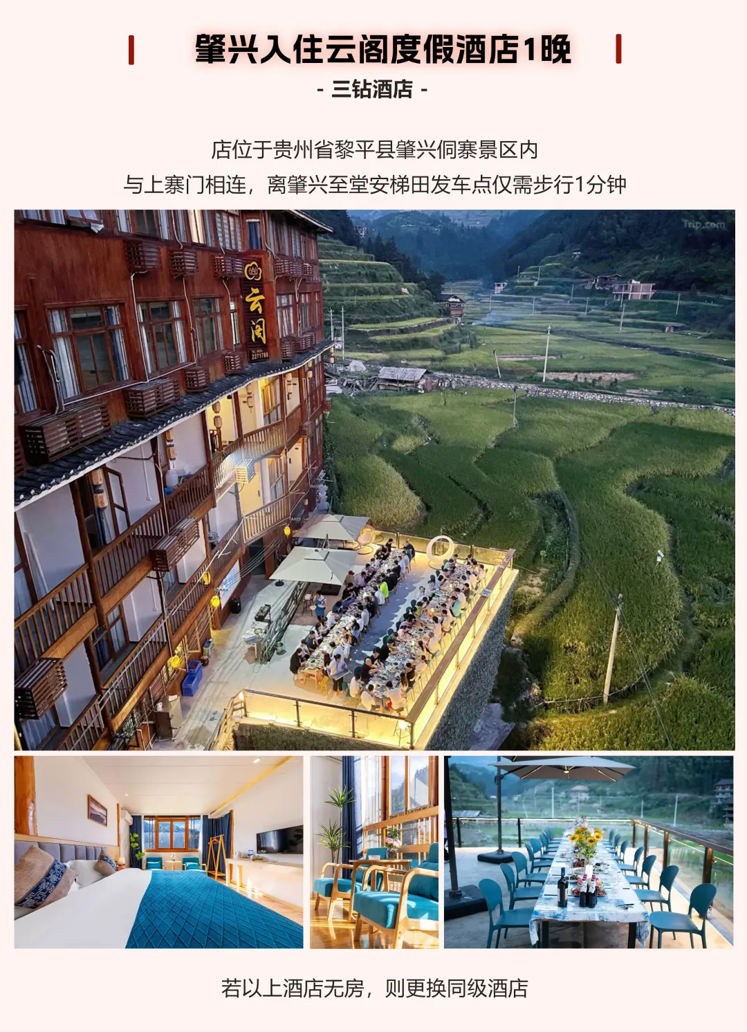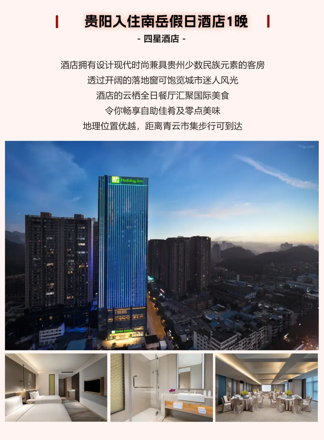 5. 贵州酒店标准偏低,请旅游者提前做好心理准备。如遇旺季酒店资源紧张或政府临时征用等特殊情况,我社有权调整为同等级标准酒店。