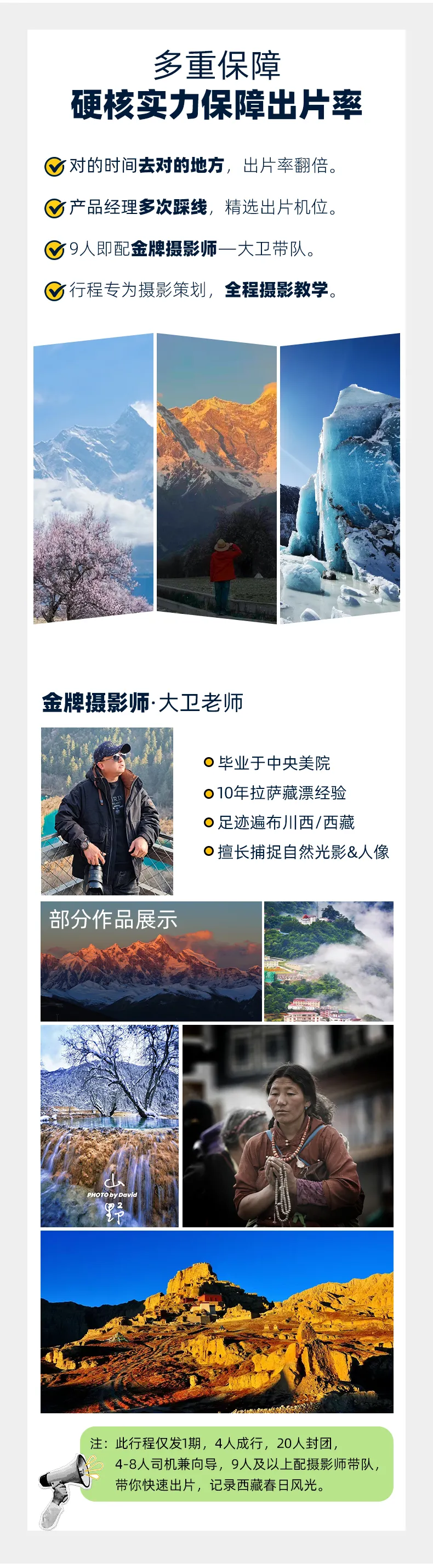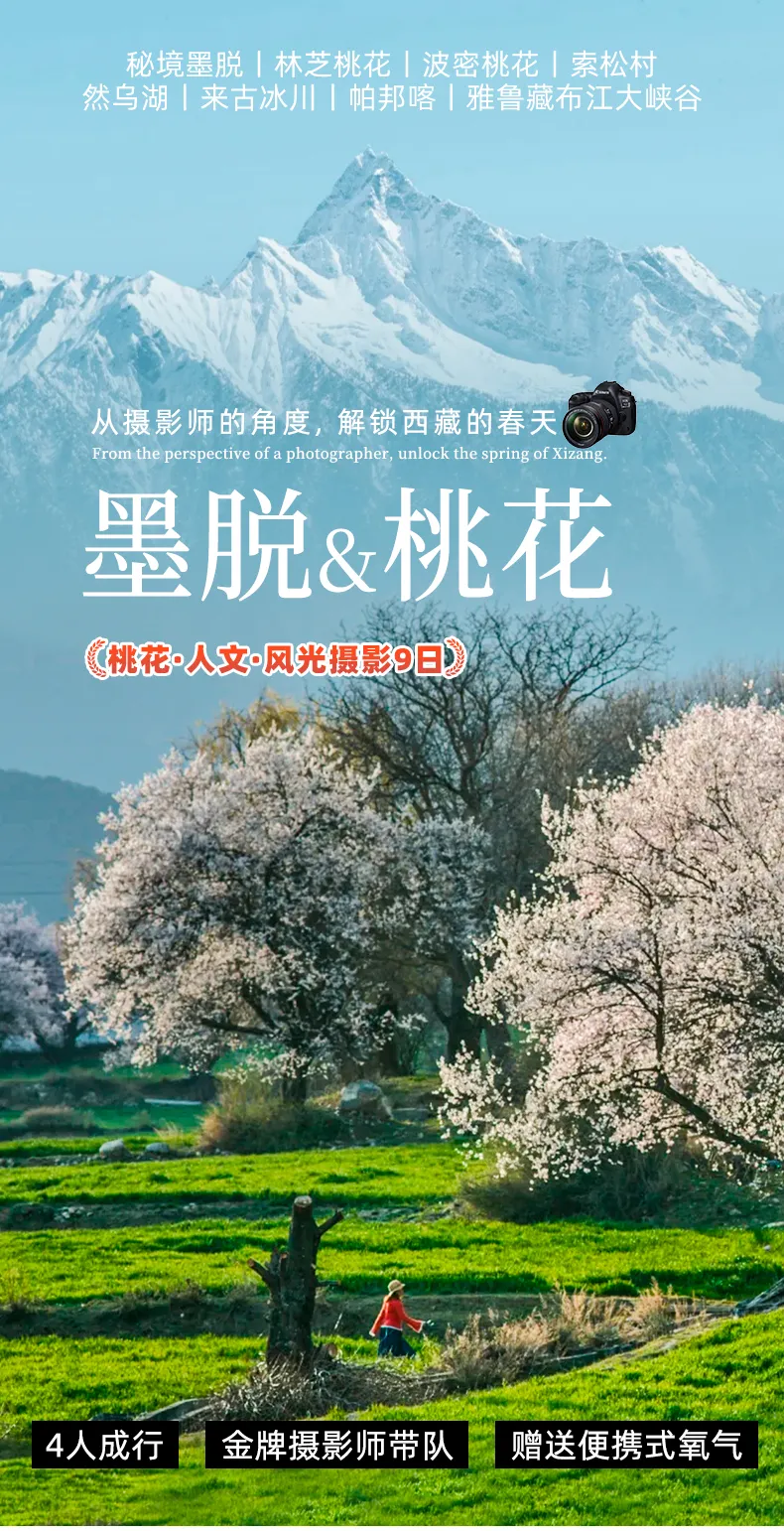 春季限定,3月22日拉萨(或3月23日林芝)集合,仅发1期,4人成行,20人封团。4-8人司机兼向导,9人及以上配摄影领队带队,带你快速出片,记录西藏春日风光。公告:领袖户外的行程安排可能会根据实际突发情况和队员反馈进行调整和优化,但调整不会涉及费用包含的景区、游览天数、集散地点以及住宿标准,最终行程安排以合同内容为准。