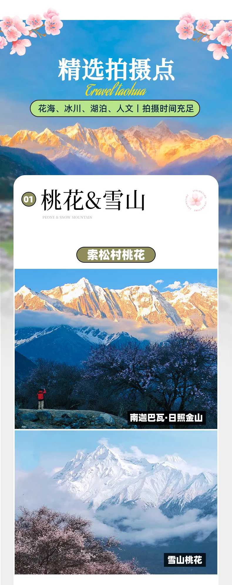 【行程概述】今日行程全天拍摄索松村及周边创作。上午至午后光线饱满,适合拍摄桃花特写、村落生活,利用侧光表现桃花与青稞田的质感。将村落民居、劳作的人群或悠闲的牛羊作为前景或中点,中景是桃花与田野,背景是雪山。展现“人神共居”的和谐。深处的达林村是人像创作的好地方,适合人文创作。傍晚(魔幻时刻) 再次等待“日照金山”,光线柔和,天空常有彩霞,雪山呈暖金色。用广角镜头同时纳入脚下的峡谷深渊、对岸的山峦肌理和远处的雪山,突出地理的雄伟。