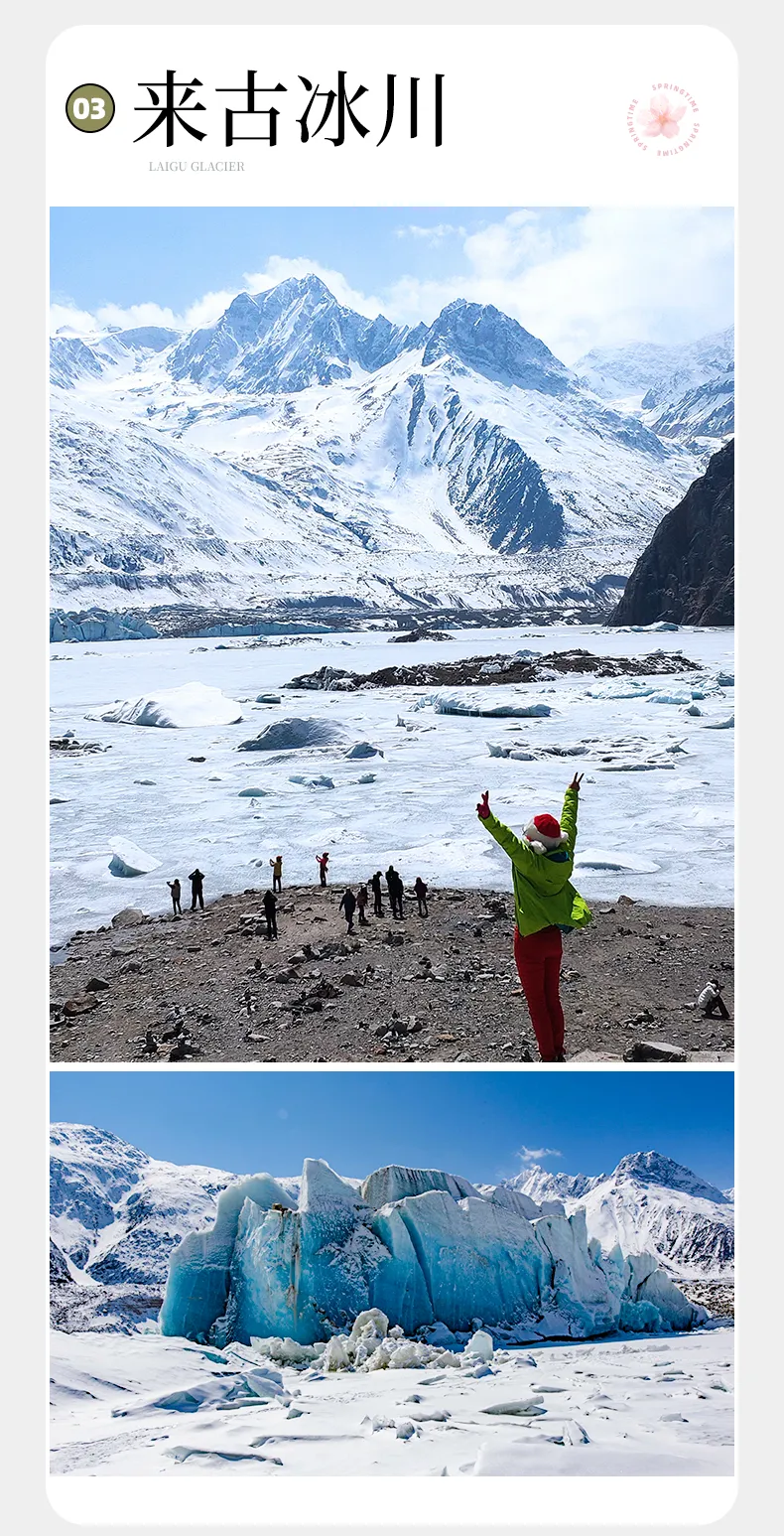 【行程概述】今日从“雪域桃源”波密,到“隐藏的仙境”来古冰川。沿着318国道向然乌湖方向行驶,帕隆藏布江峡谷的恢弘画卷在车窗外展开。请将相机置于手边,这条公路本身就是风景长廊,每一个转弯都可能邂逅雪山、森林与奔腾江河同框的宏大意象。【然乌湖】如一块巨大的绿松石镶嵌在雪山之间。这里是拍摄雪山倒影的经典机位。而后前往【来古村】赏世界级的蓝色冰川,在藏东南的雪山怀抱中,来古冰川的蓝冰在阳光下折射出幻境般的光晕,仿佛时间在此凝固,准备好迎接震撼了吗?来古绝对是我们历年来摄影师给予好评最多的地方,纯净带着些许蔚蓝的【来古冰川】、原始淳朴的藏式村落,如果说这个星球上真的有洗涤心灵的地方,那么一定非来古莫属了。游玩之后沿318线原路返回,傍晚抵达雪山环绕中的波密入住。