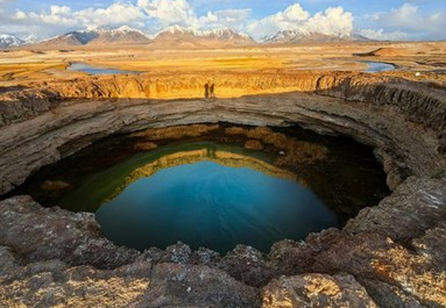 正午时抵【木吉火山口】。喀日铁米尔火山群静静地蹲在帕米尔的荒原上,十三个巨大的凹陷像大地睁开的眼睛。你沿着木栈道走向一号火山口,海拔3800米的高度让每一步都略显沉重。火山口内积着一洼蓝绿色的水,平静得不像是1500年前曾咆哮过的巨兽。远处,十八罗汉峰的雪线锐利如刃,像一群披着白袍的沉默僧侣。