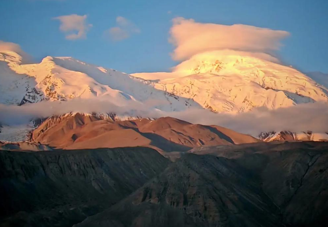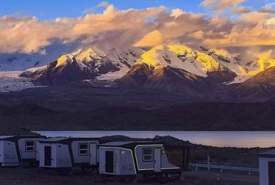 暮色四合时抵达喀拉库勒湖畔的不周山营地。此时慕士塔格峰正收起最后的金边,深蓝暮霭从湖面升起。房间的落地窗整面朝向冰川,今夜枕着海拔3600米的寂静入眠。天气晴好时躺在床上即可见银河横跨慕士塔格峰,日出时湖面呈“日照金山”倒影 。
