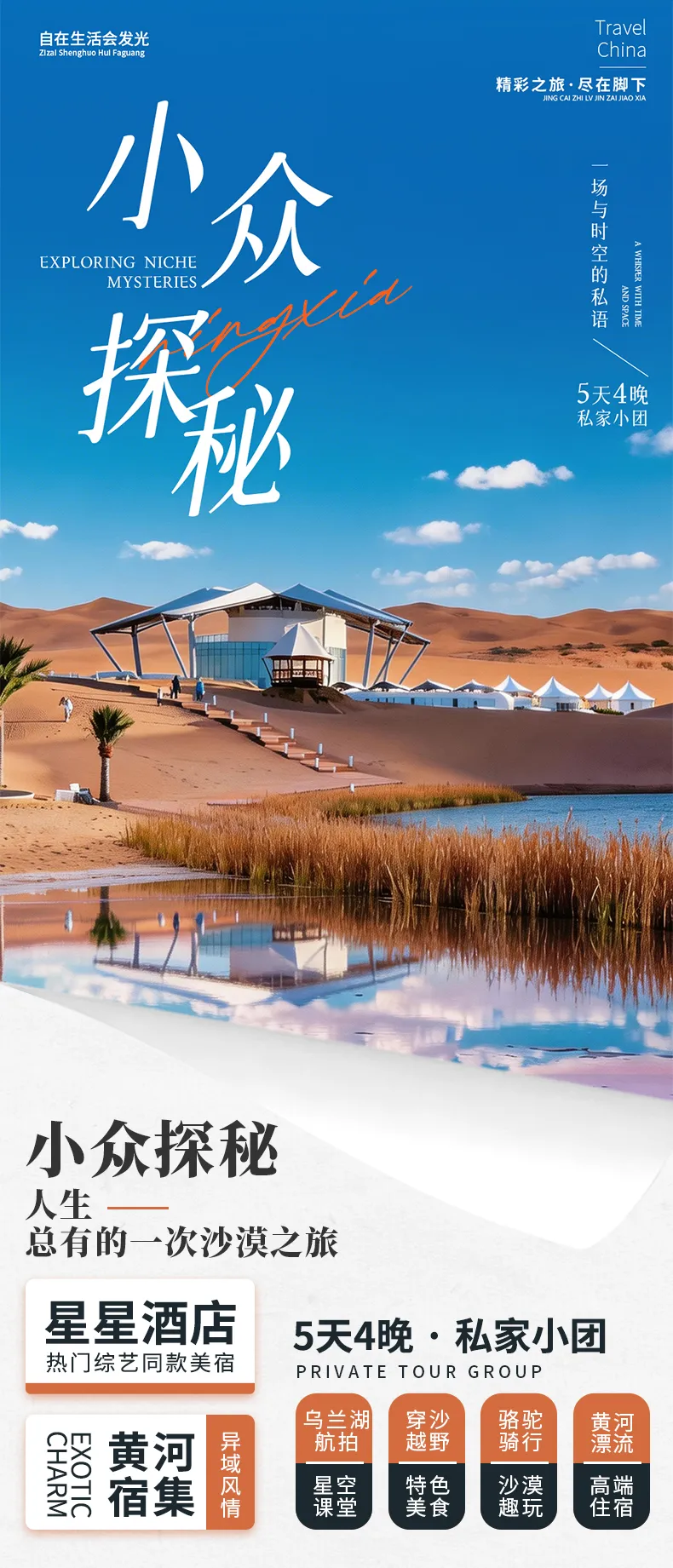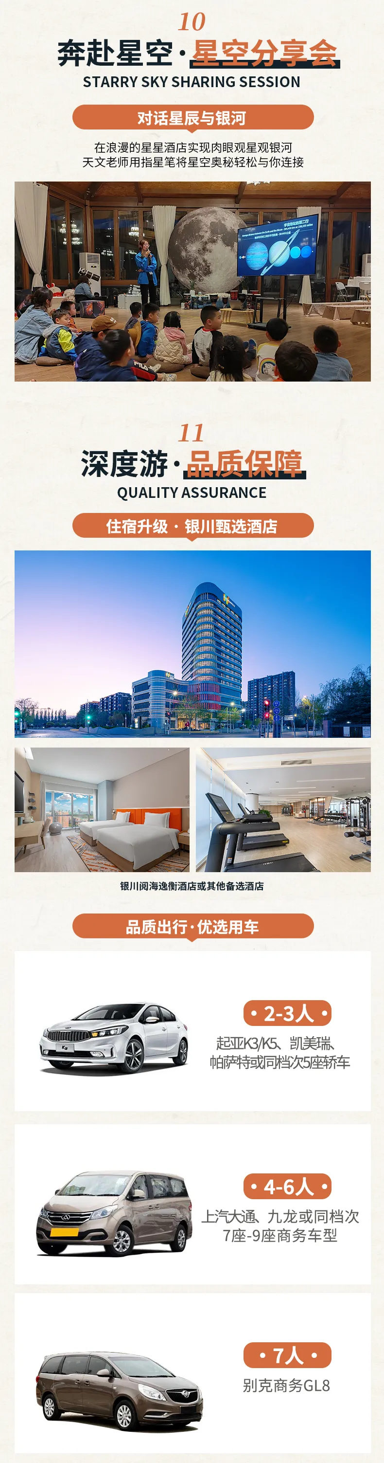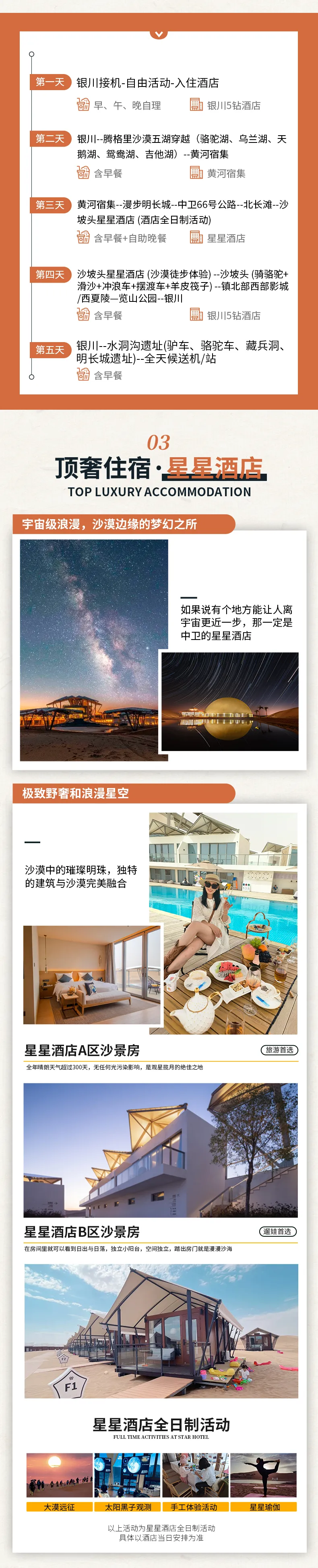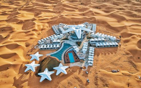 沙漠星星酒店,顾名思义,让你身处沙漠,仰望星空。白天玩转沙漠,夜晚静观星辰。每间客房都包含早餐,且配有独立卫浴,洗漱用品均为“欧舒丹”品牌。所有用水都是通过沙漠 200 米深井抽取的深层矿泉,绝对高端、卫生放心。玩沙归来,洗个热水澡,清清爽爽地去星空餐厅吃一顿沙漠晚餐。晚上还有免费的室外星空讲座,不到一小时的时间,你就能基本认清木星、火星等相邻天体,还可以通过天文望远镜肉眼观测。最后,在星空下合影银河,留下美好回忆。