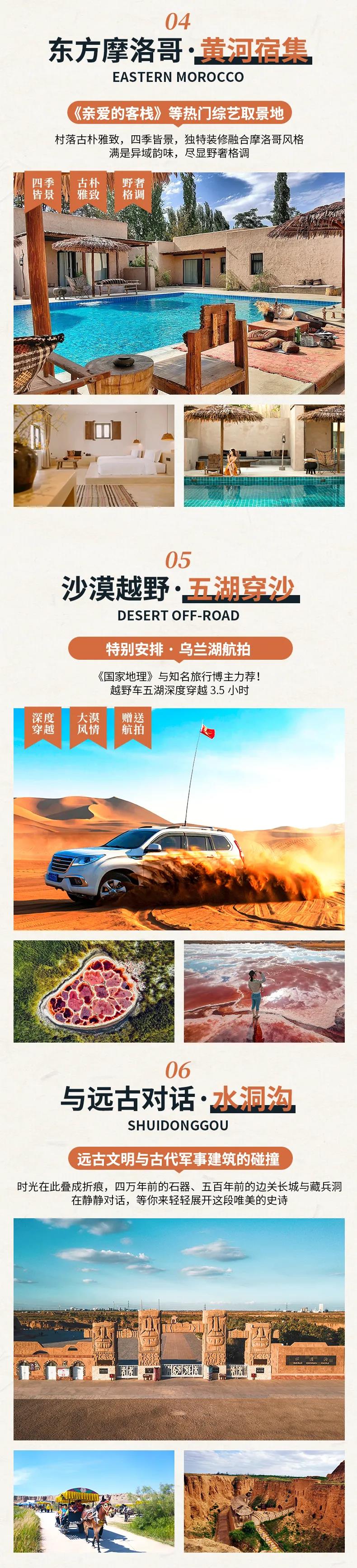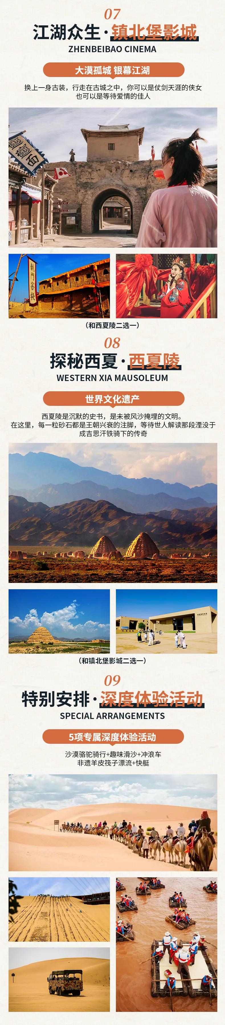 14:00午餐后,乘车前往中国北方文化小镇【镇北堡西部影城】(约:200KM,车程:2.5小时,参观时间:3小时)当你踏入影城的大门,仿佛穿越到了另一个世界。残破的城墙、荒凉的沙漠、古老的戏台,每一个角落都散发着浓厚的历史气息。在这里,你可以看到《红高粱》里的月亮门,《东邪西毒》里的大嫂桃花屋,《大话西游》里的至尊宝和紫霞仙子,还有《新龙门客栈》里的龙门客栈。这些曾经只能在电影里看到的场景,如今就在你的眼前,让你亲身感受电影的魅力。在镇北堡西部影城,你不仅可以欣赏到古朴的建筑和壮丽的自然风光,还穿上戏服,化身电影中的角色,体验一把当演员的感觉。 或乘车前往【西夏陵国家遗址公园】(含博物馆、电瓶车、3D电影观影)(车程约:2.5小时,参观时间:3小时)如果你也有一份西夏情怀,那就不要错过西夏陵,背靠着巍峨的贺兰山 ,被称为“东方金字塔”的西夏陵,一直披着一层神秘的面纱。虽然已遭到了毁灭性的破坏,但骨架尚存。宏伟的规模,严谨的布局,残留的陵丘,仍可显示出西夏王朝特有的时代气息和风貌。西夏博物馆是以西夏陵为背景,修建的西夏历史博物馆,真实形象地提示了西夏王国的兴衰历史,让人们领略西夏王国昔日的辉和灿烂,定会勾起您的无限遐想。