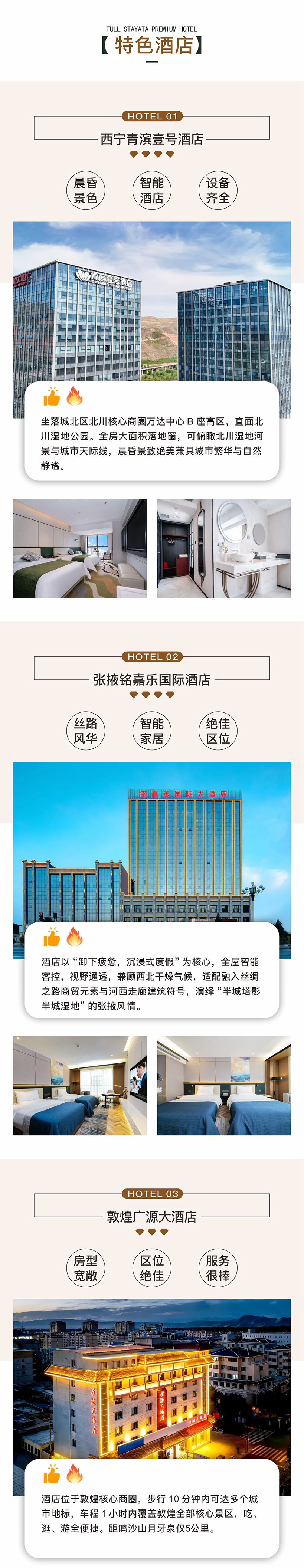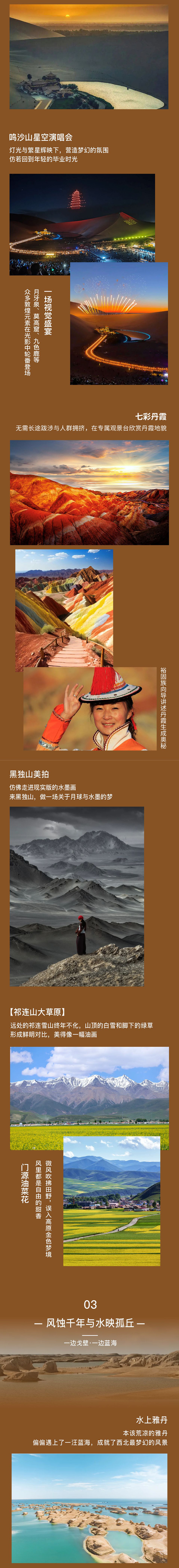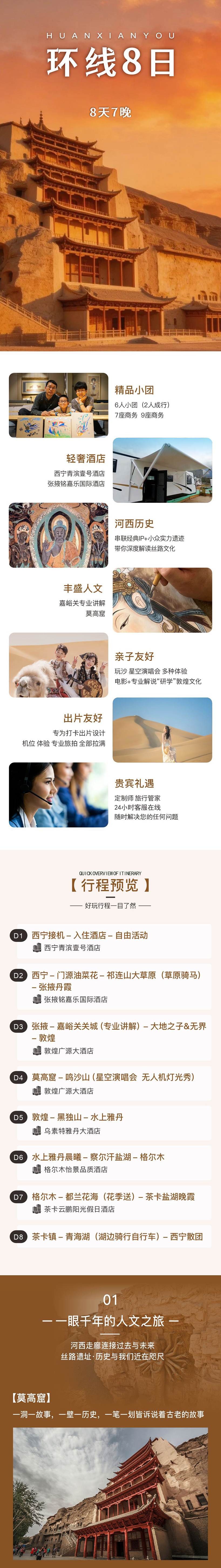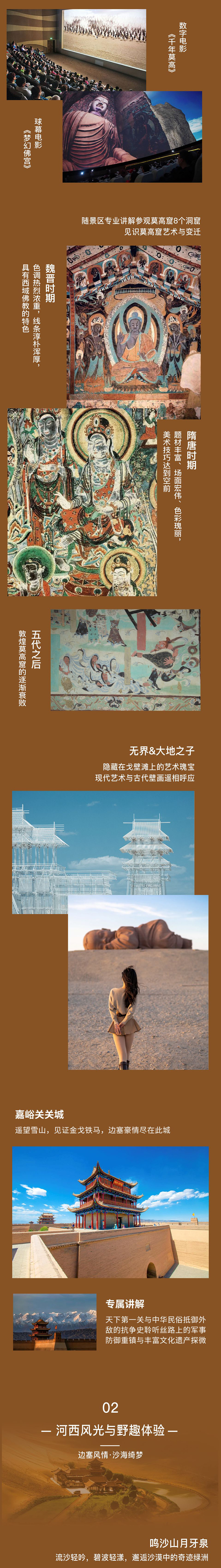 一早出发前往素有“东方艺术宝库”之称的莫高窟参观,看8个窟加2场数字电影,专业讲解带大家深度解读莫高露,让人文爱好者读懂完整的丝路石窟艺术史。 正午回酒店休息,顺便把酒店的庭院下午茶、非遗手作全体验下,也刚好避开西北毒日头,不晒黑不花妆。 等太阳西斜,我们再去鸣沙山, 晚上也别着急走,万人星空演唱会的声浪,与无人机灯光秀,绝对让孩子兴奋得欢呼,内敛的大人也能跟着嗨起来,绝对能释放一整年的压抑!今晚继续住敦煌,连住不挪窝,省去收拾行李的麻烦。