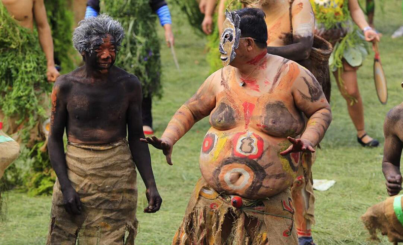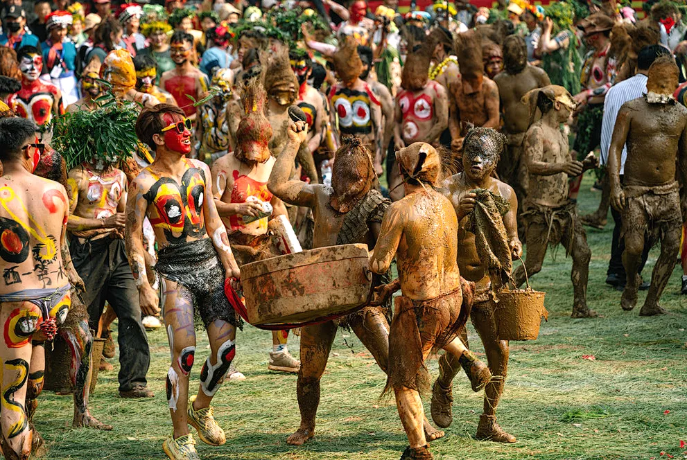 弥勒 祭火节准备化妆 在祭火还没有开始之前,参与祭火的成员们会到村中心的公房进行化妆和道具准备,他们用棕叶遮体,用五彩泥绘身,再现了阿细祖先原始的模样。