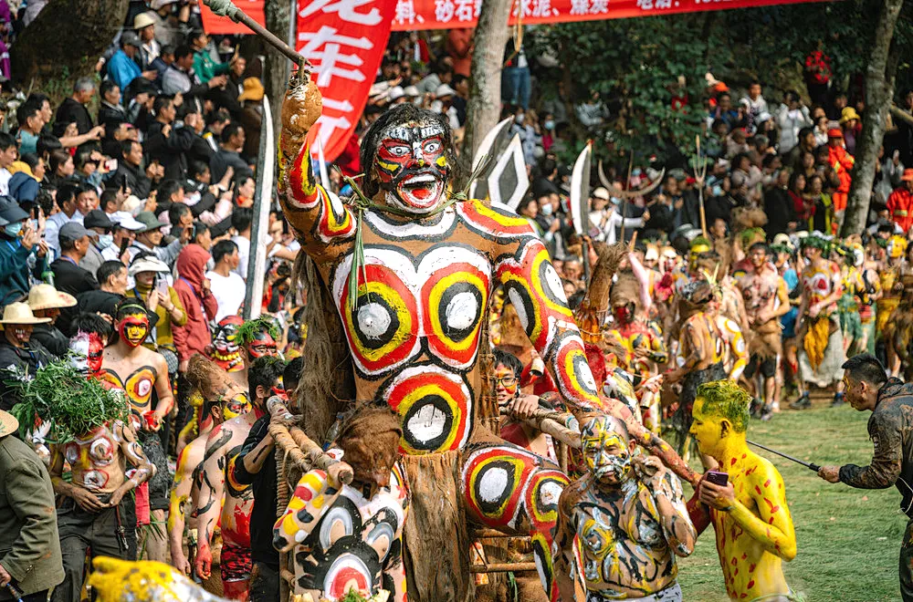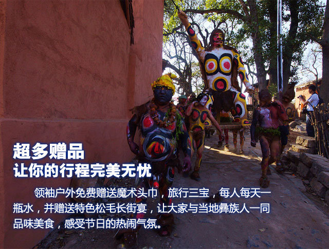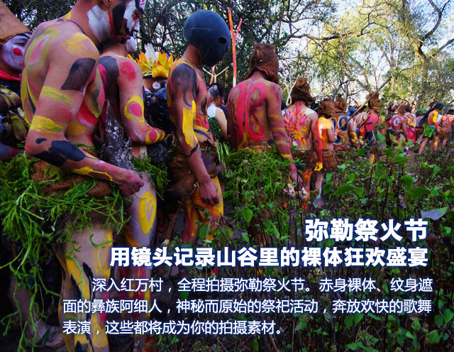 早上赶早进入【祭火节主会场】,不要吝啬你的手机或相机快门,准备好充足的内存,全天拍摄神秘的阿细祭火活动:钻木取火、跳火神、阿细跳月、松毛长街宴等,感受东方的狂欢节!这一天,十里八村数以万计的村民涌入狂欢现场,“祭火节”完全是一个盛大的化装舞会,神圣的火种从朽木中钻出,在天籁幽幽火光和醺醺浓烈气氛中,狂欢的彝族同胞不穿平时外衣外裤,化着装,蒙着脸,彩绘着身体,围着火堆,在神奇迷幻的音响声中摇曳行进,载歌载舞尽情狂欢,参加活动的男人安排挖取朱砂锗石,捣碎后浸泡做纹身的颜色,为参加祭祀的人们画纹。人们将红、黄、黑、白、褐这五种代表大地的颜色,相互在身体的各部位涂抹,绘出各种图案。