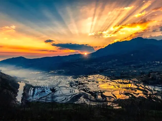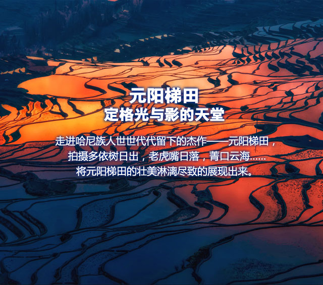 最后去【坝达梯田】拍摄日落。坝达景点是申报世界文化遗产核心保护之一、坝达梯田气势磅礴、面积广阔、立体感强、从海拔800米的麻栗村河起、依山而上、3700多级梯田棉不断、廷伸至海拔2000多米的高山。晚上入住元阳景区酒店。