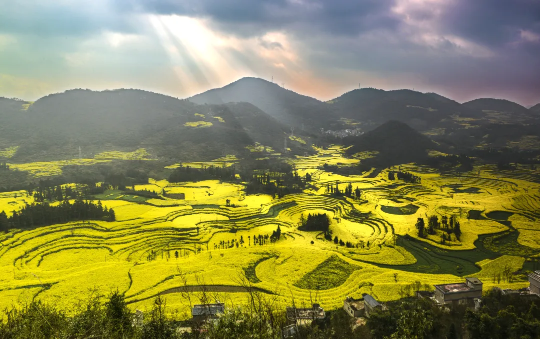 下午晚点前往罗平【金鸡峰从】,此处地方比较灵活,大家可以分开游玩摄影,金鸡峰可以在山头上拍摄,山不高,天气好可以拍摄到耶稣光射到云雾中若隐若现的油菜花以及金鸡峰群中。春天的罗平满眼都是金灿灿的黄,几十万亩油菜花满山偏野地开放,非常充裕的时间留给您尽情拍照,还为您准备了特色民族服装让您尽情地放飞自我,凹造型!