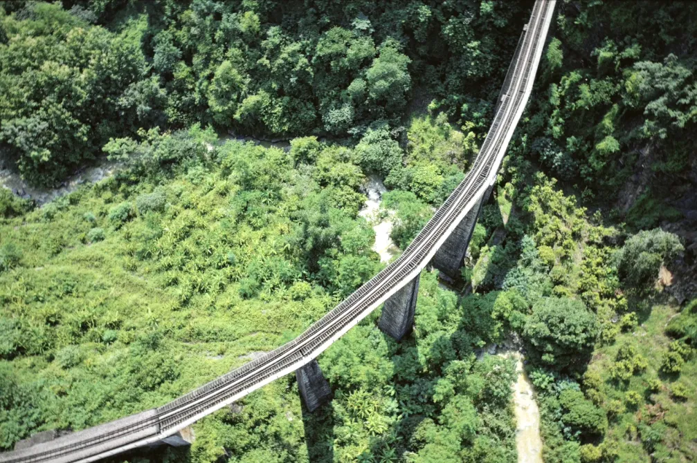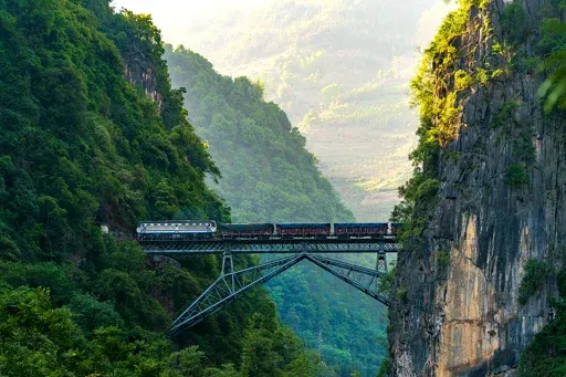 随后沿着国道,途径大片荔枝园后,来到【人字桥村】,我们来一段滇越铁路的【轻徒步体验】,沿着铁轨前行几百米,穿过山洞,近距离的来到桥边,观看用800余名中国劳工血泪建成的已经沿用了100多年的的人类奇迹—【人字桥】。运气好,还能看到经过桥上的运输货物的货运火车。看完桥以后就返回下来谷底,沿着峡谷栈道,从另外一个角度还可以看到它的全景风貌。
