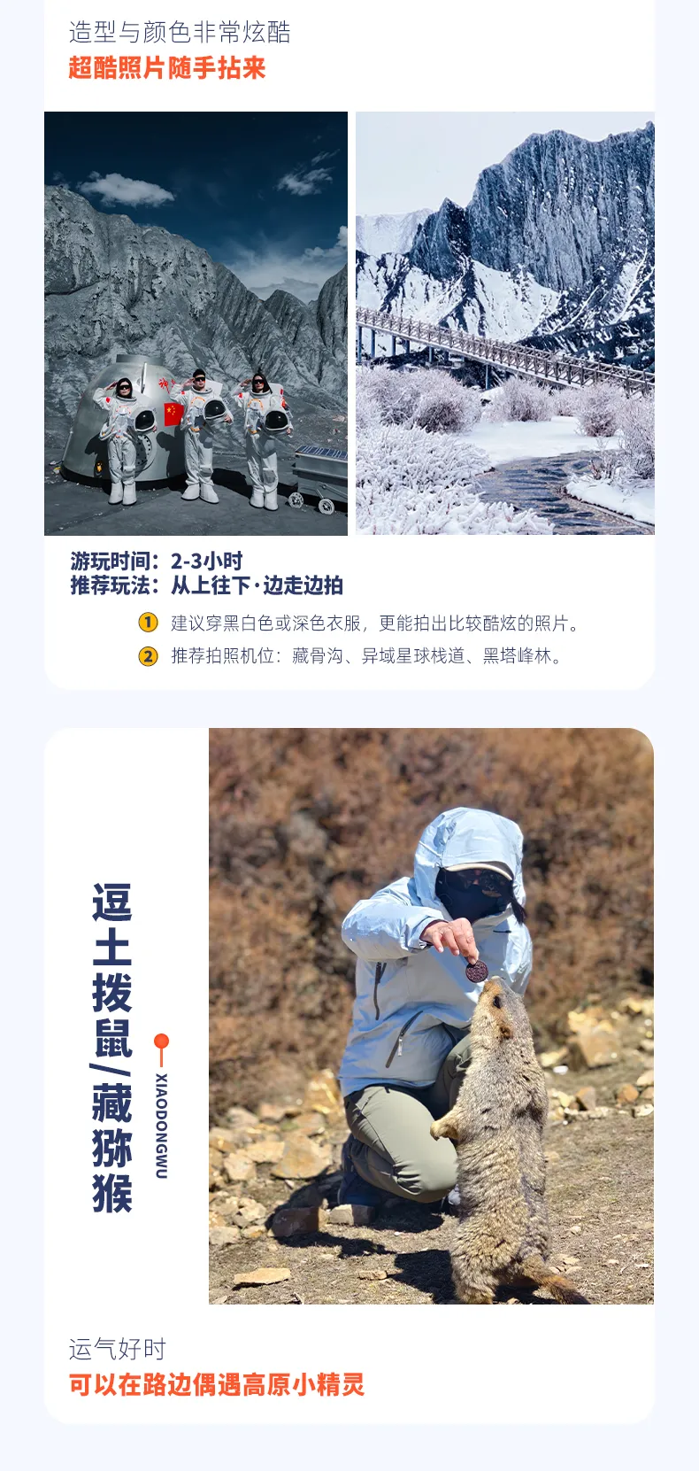 9、服装:每年3月-6月,着冬装,衣服三件套是最佳(保暖排汗内衣+抓绒衣+冲锋衣+速干衣裤);7月-9月着春秋装,备冬装。10月着冬装。