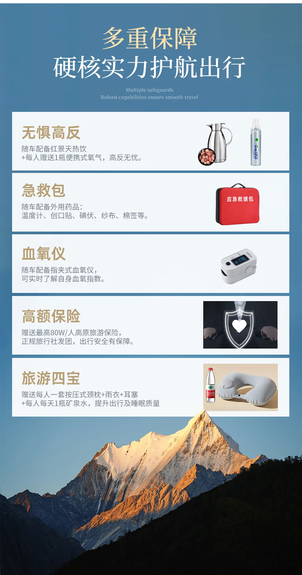 (3)特别声明:我社因没有医疗资质,随车只提供瓶装氧气,无任何药品,请提前备足适合自己的药品。