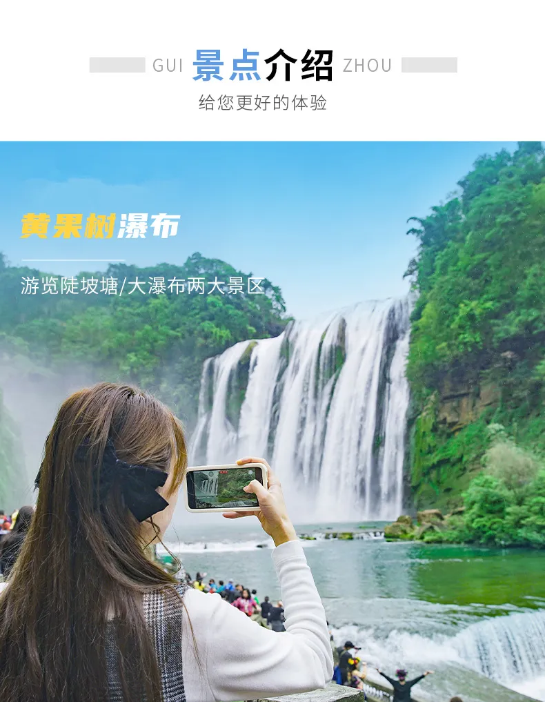 上午:酒店早餐后乘车前往中国第一批“国家重点风景名胜区”(车程约2.5小时),国家5A级风景区黄果树景区,亚洲第一大瀑布群;景区由【天星桥】、【黄果树瀑布】、【陡坡塘瀑布】三大景点组成游览时间约为6-7小时。到景区后换乘景区环保车(不含环保车50元/人,保险10元/人,必须消费敬请自理),游览有水上石林、天然盆景之称的【天星桥】天星桥全程(游览时间2.5小时左右),脚踏在石上,人行在水中,小桥流水,曲径通幽,在石缝中穿行,打卡有趣的数生石和最美丽的银链坠潭瀑布。 之后游览亚洲最大,贵州必游景点【黄果树瀑布】(不含单程扶梯30元/人,往返50元/人,非必须消费,自愿自理),游览不少于3H;黄果树大瀑布宽101米,高77.8米,是世界上唯一可以从上、下、前、后、左、右六个方位观赏的瀑布,峭壁震颤,谷底轰雷,十里开外也能听到它的咆哮,溅起的水雾可弥漫数百米以上。【水帘洞】从其腰间全长贯通,是1986版西游记水帘洞取景处,能从洞内外听、观、摸瀑布,洁白的水帘飘然而下,扬扬洒洒,如绸缎飘舞,如仙袂飘举,如淑女浣纱,观【犀牛潭】,感受瀑布之壮美,品大自然之奇妙。