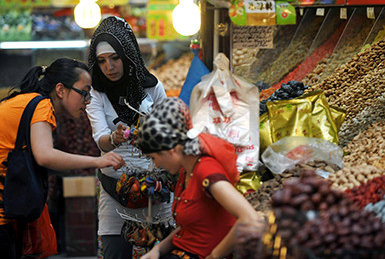 【国际大巴扎】——世界上规模最大的巴扎(巴扎为维吾尔语,意为集市)。具有浓郁的伊斯兰建筑风格,体现了浓郁的西域民族特色和地域文化,这里除了有令人眼花缭乱的商贸市场外,还有美食广场、观光清真寺、80米高的新疆第一观光塔等设施。