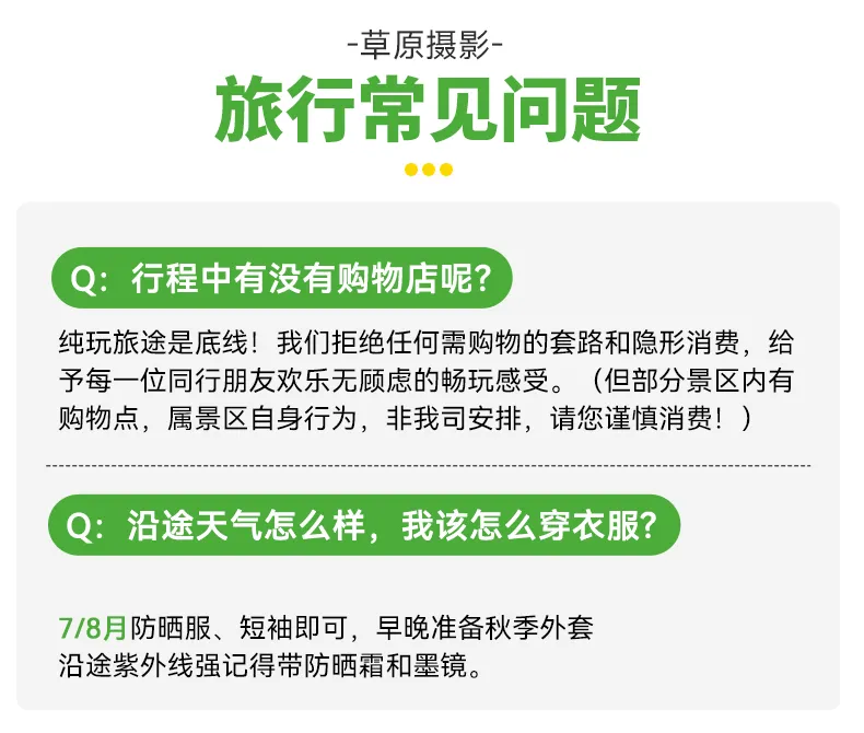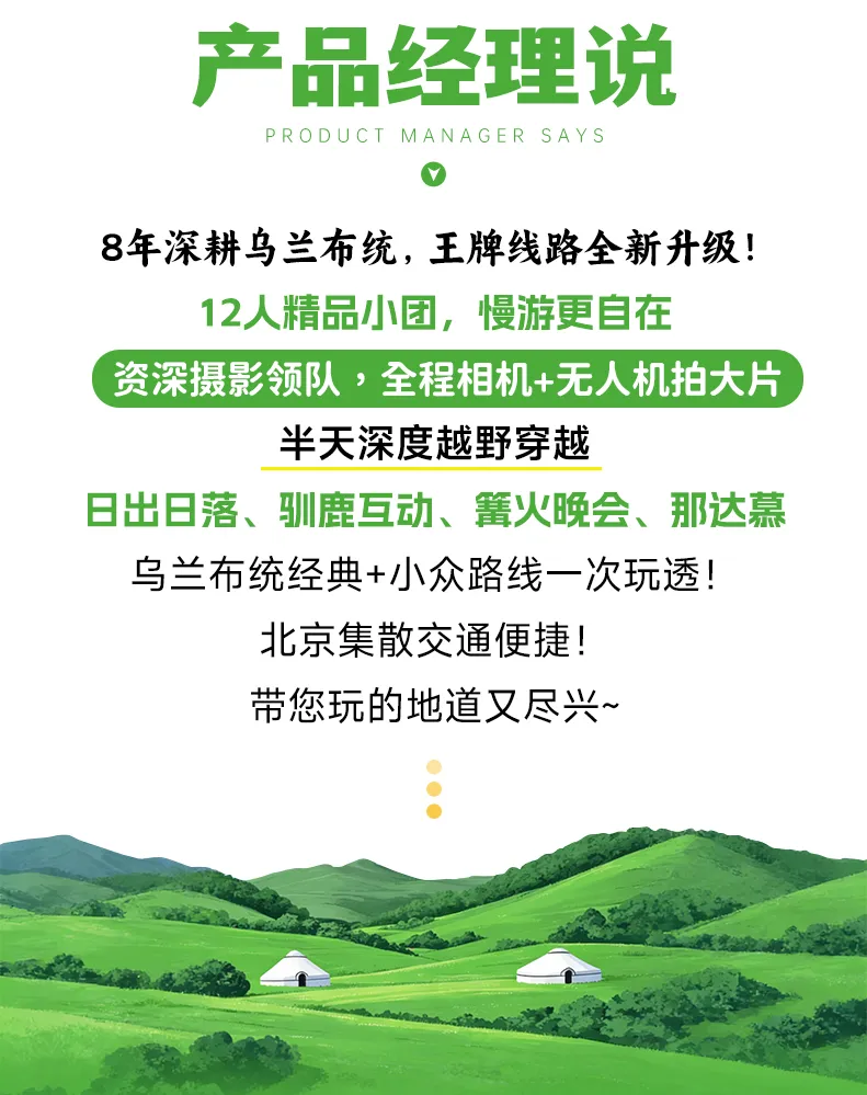 中午在景区附近自由午餐或领队组织AA吃饭,午饭后集合返京(150KM,车程2-2.5小时)。非常幸运和大家共享草原之旅,期待我们的下次相遇。