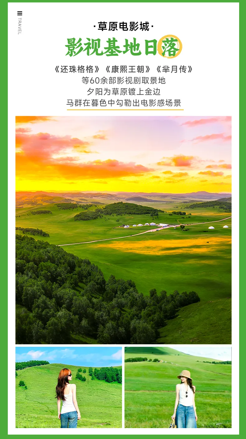 待到夕阳西下,登上影视基地木栈道俯瞰草原日落。余晖漫染天际,云霞被落日镀上金边,光影交织成一幅壮丽的天然画卷,所有温柔与浪漫,都定格在这一瞬里。