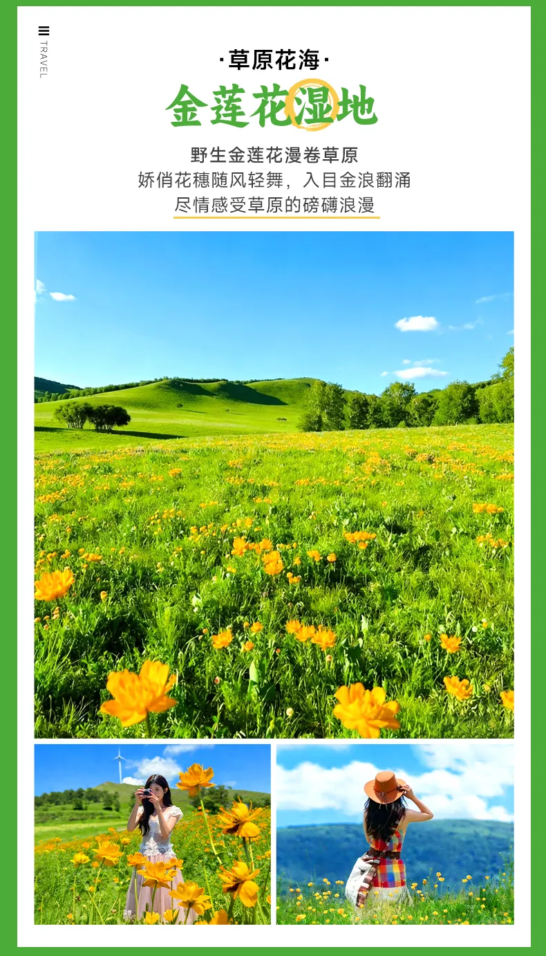 【金莲花湿地】是草原上的天然湿地,夏季时大片金莲花盛开,宛如“小火苗”点缀在绿茵茵的草地上,清新淡雅,美不胜收(*金莲花为季节性景观,以往花期为7月初到7月下旬,受天气和温度影响)。