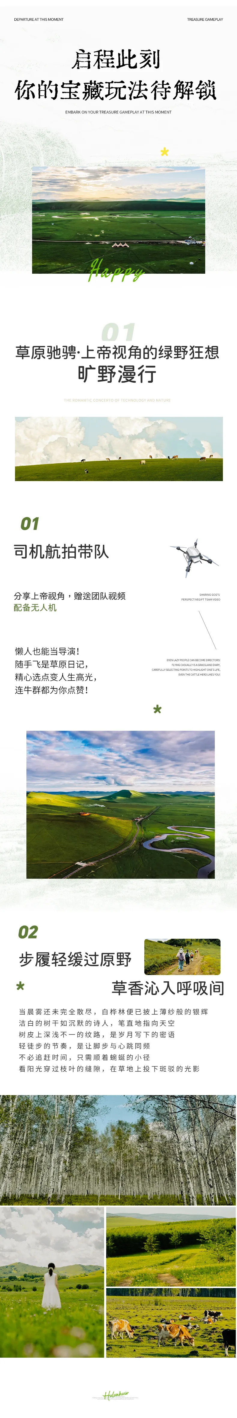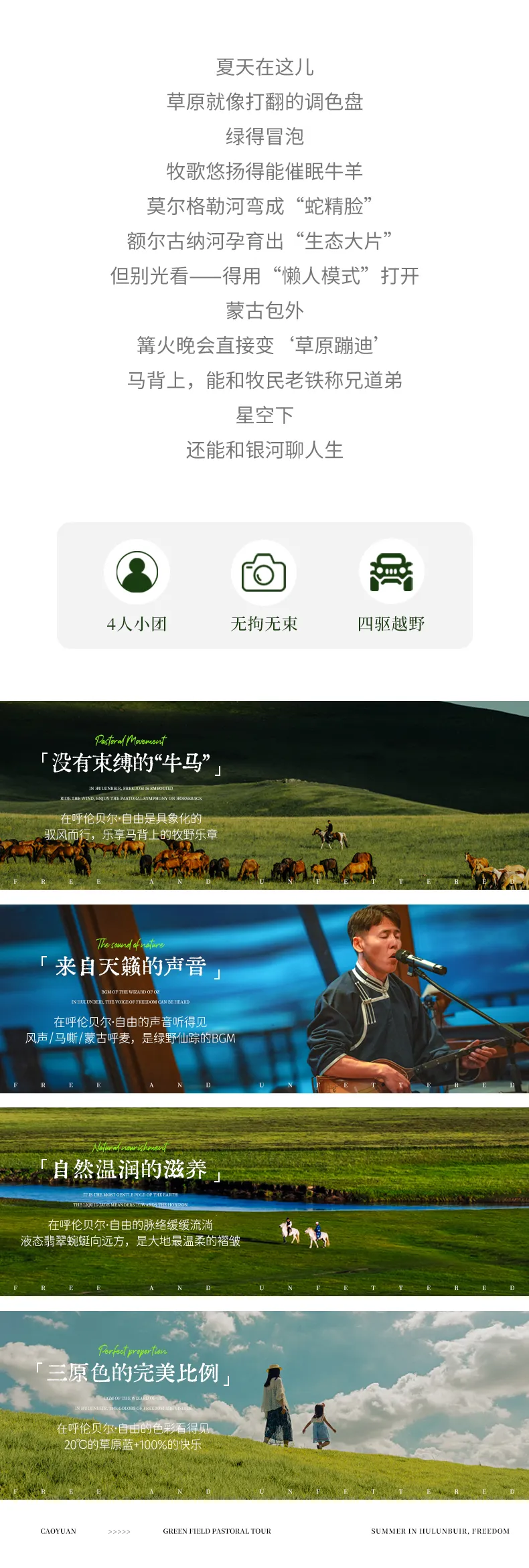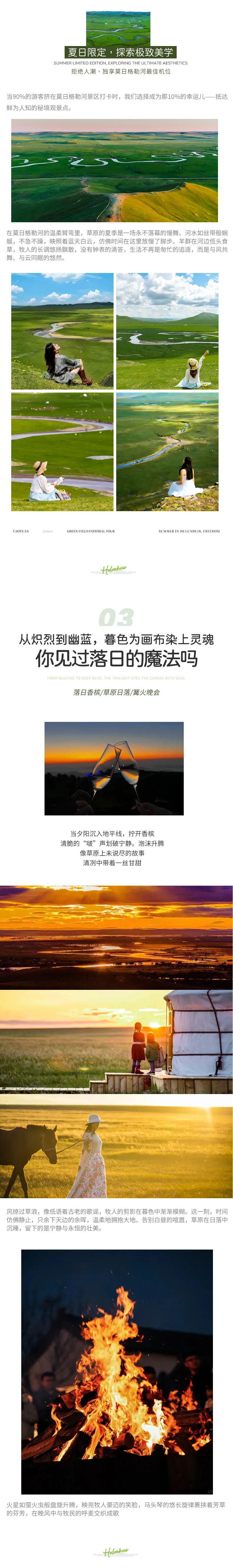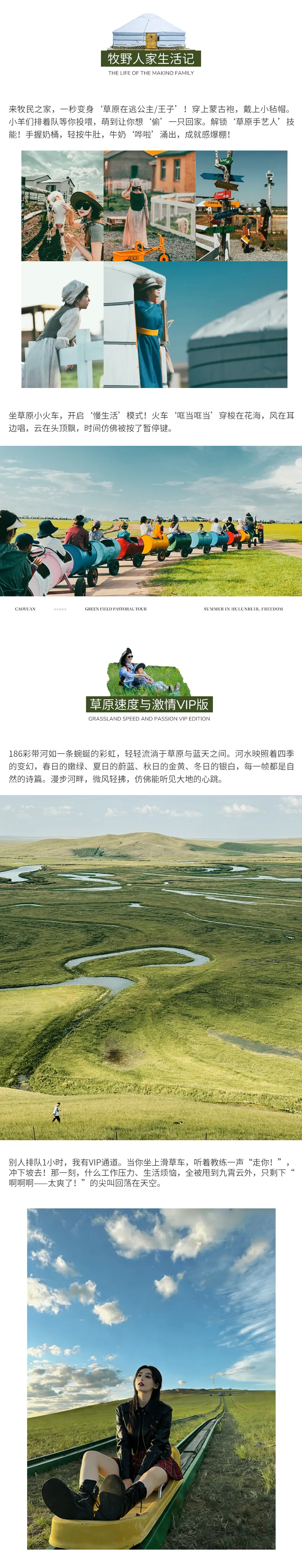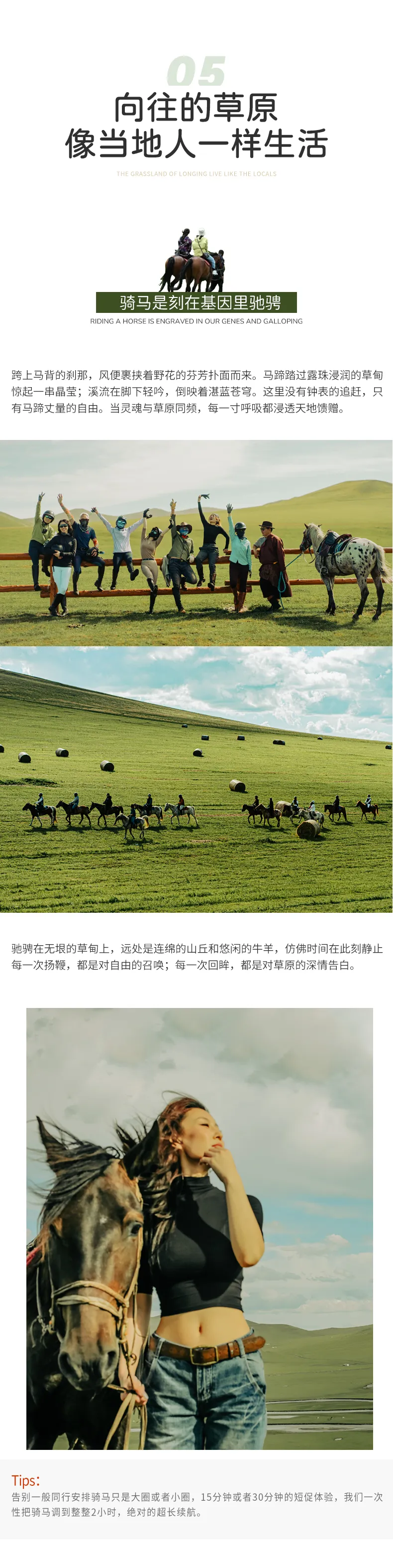 2. 穿戴:草原早晚温差较大,早晚较凉,中午又比较热;白天温度可以参考出行前的天气预报,但是建议根据出行季节携带薄/厚外套,以抗风冲锋衣软壳系列为佳;夏季带正常夏装,春秋带长衣长袖或者冰袖,最好穿长裤避免晒伤;骑马的时候推荐牛仔裤耐磨或者紧身长裤,鞋子以舒适运动鞋/户外登山鞋为主。不知道穿啥,白色肯定不会错,低饱和浅色系列:白、米、蓝、黄、红、绿、咖啡色,都很出片。