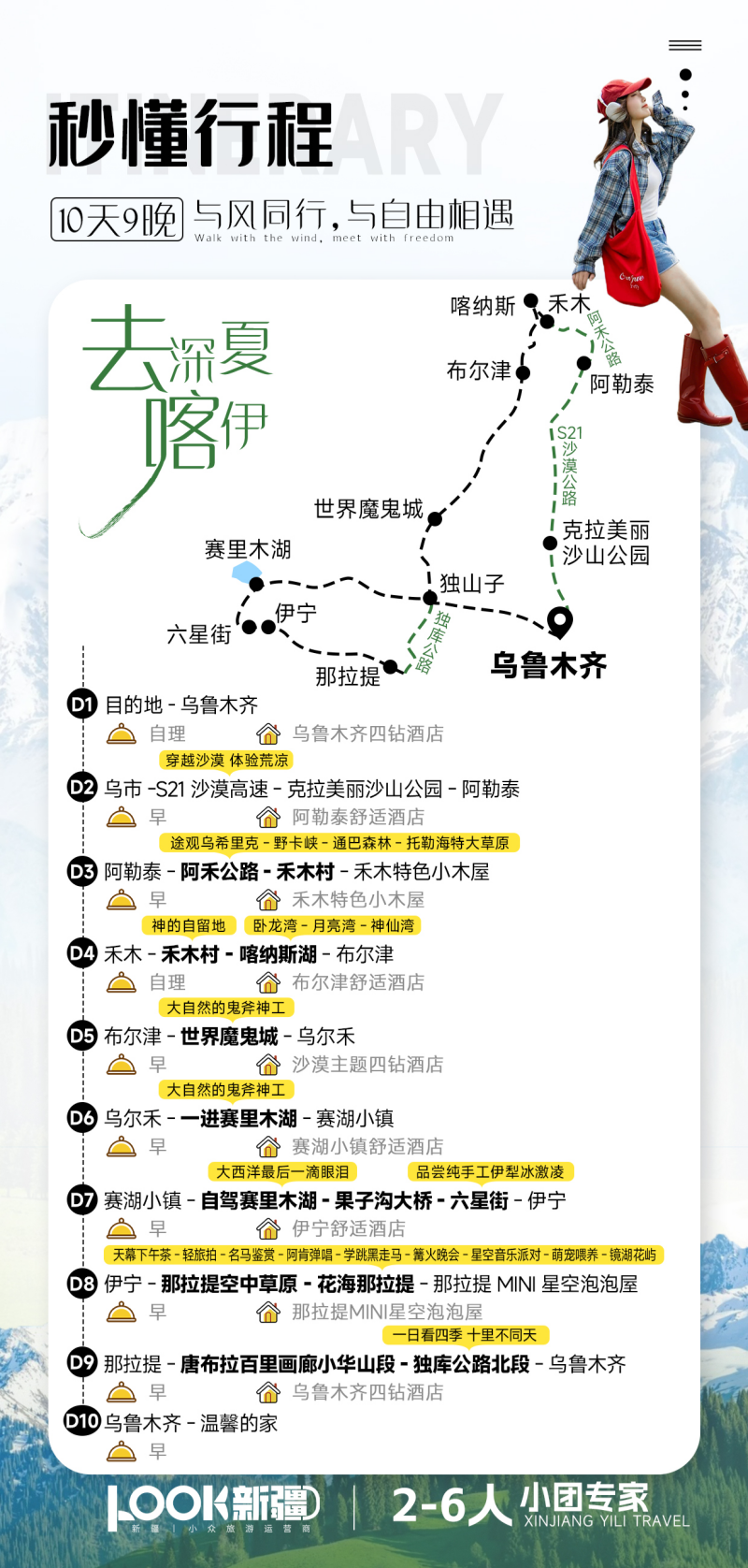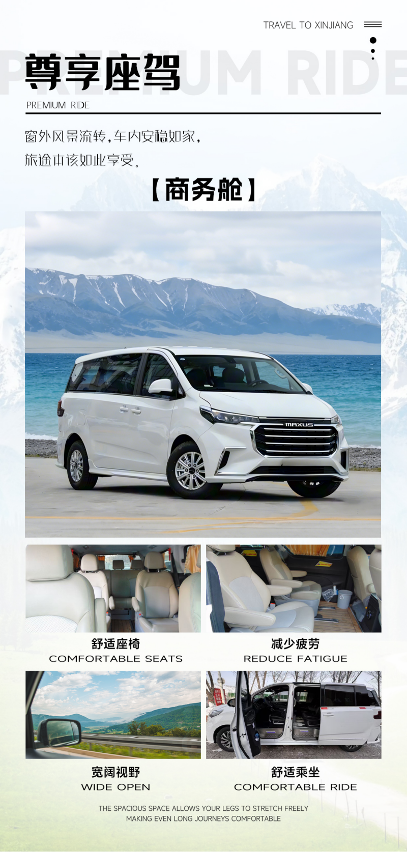 关于用车:本社严格选用有合法营运资质的车型,所有车辆均通过年审及定期安全检测,不接受指定车型要求。根据新疆运管局规定,营运车每天行车距离不可超过 600 公里。如超出 600 公里数,司机将面临 2-10 万的巨额罚款/吊销营业执照。因此,行程计划之外的日常出行活动,建议您自行安排出租车、网约车或其他交通,感谢您的理解与配合。