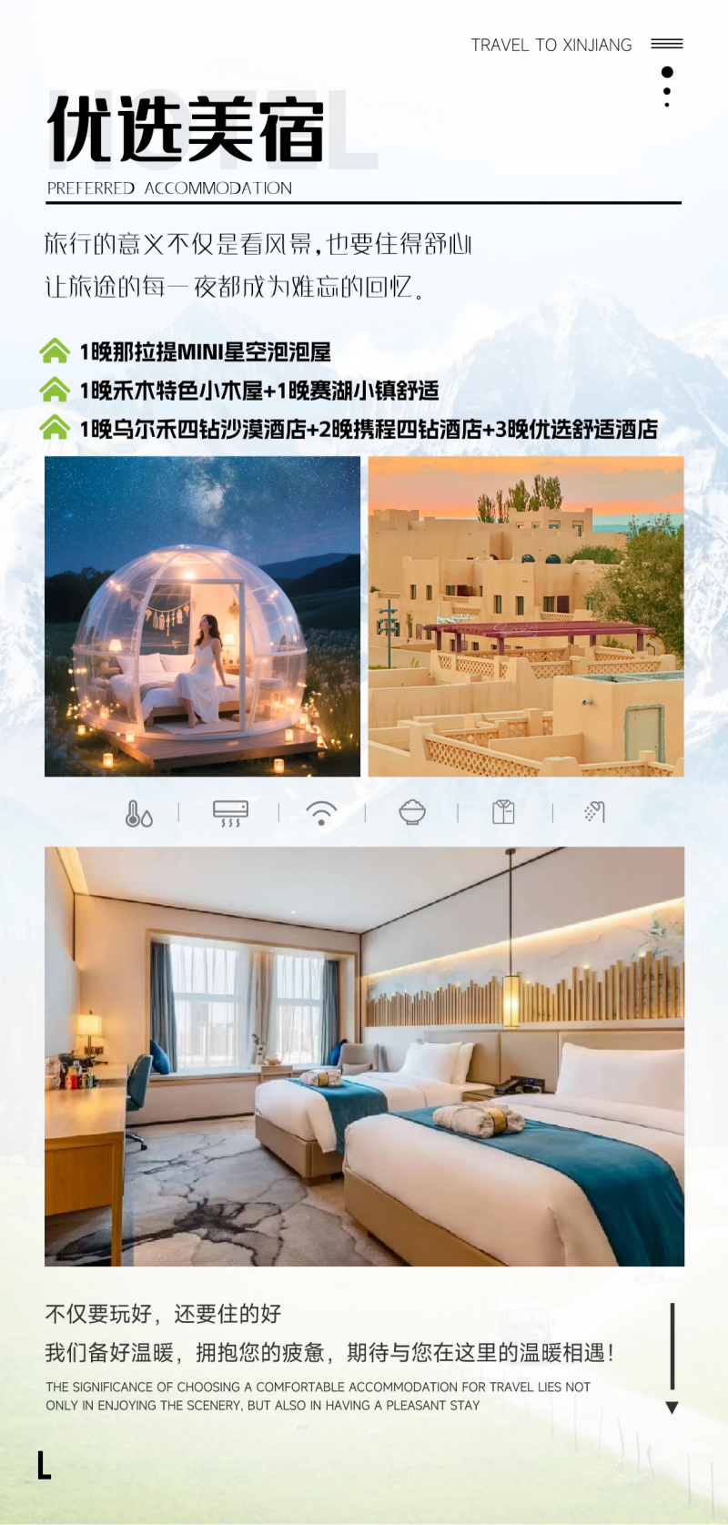 关于住宿: 由于新疆仍然属于欠发达地区,酒店和内地有很大差异,尤其在景区,只能保证干净卫生。即使如此,旺季依然一房难求.大部分酒店没有三人间。此产品不接受儿童单独拼房,也不接受带儿童的成人游 客拼房;如您单人带儿童出游,出发前必须补齐单房差或儿童按成人占床报名。