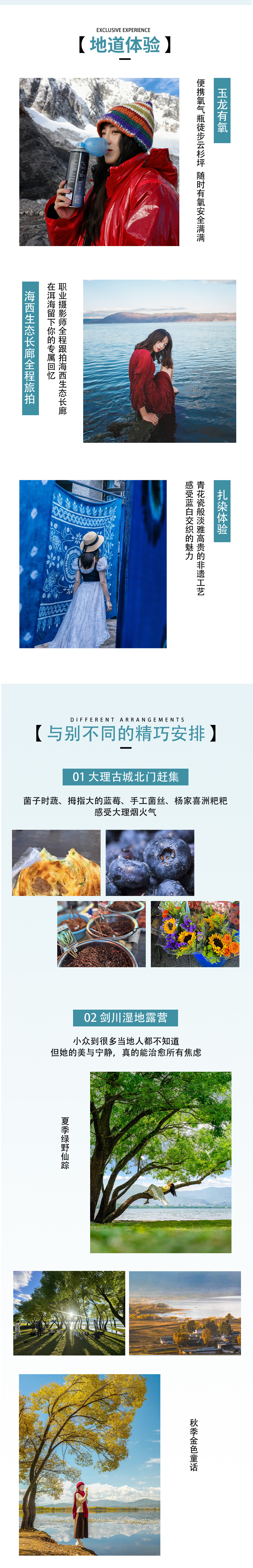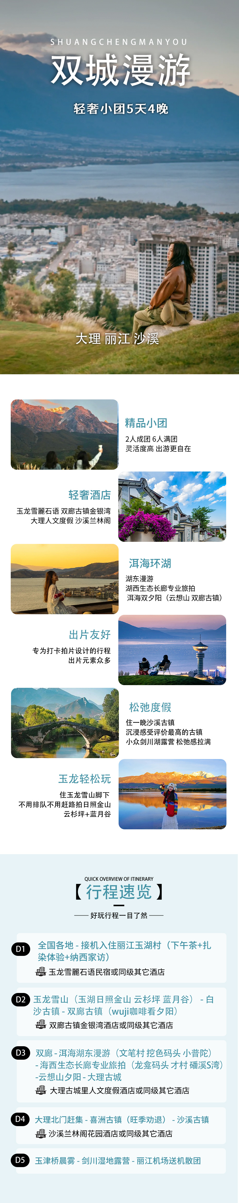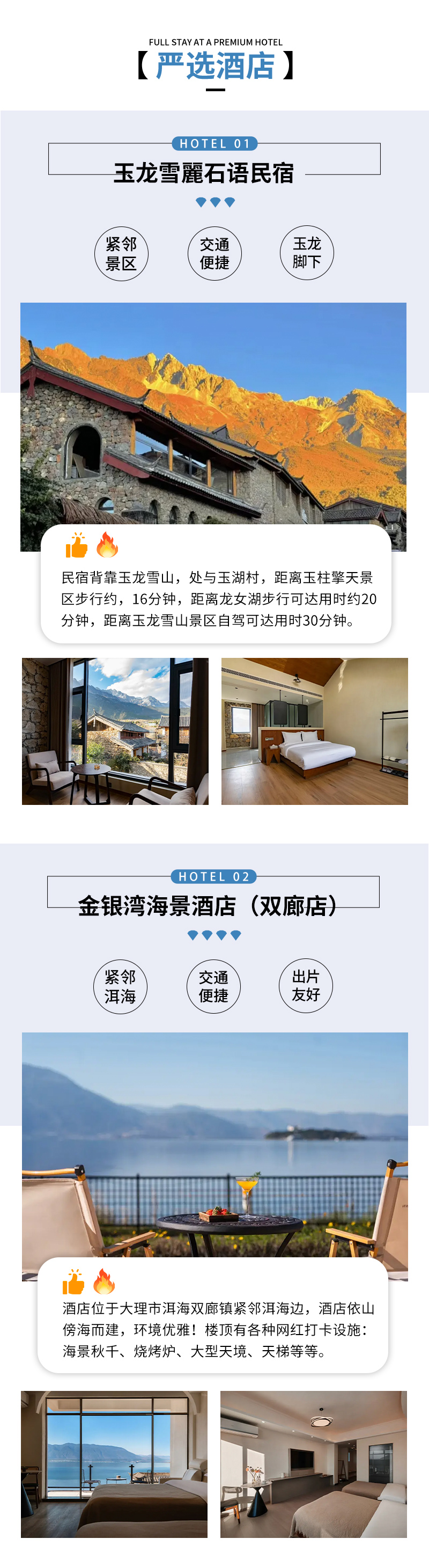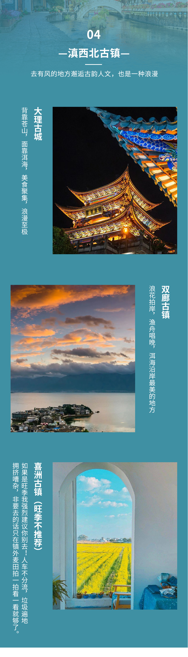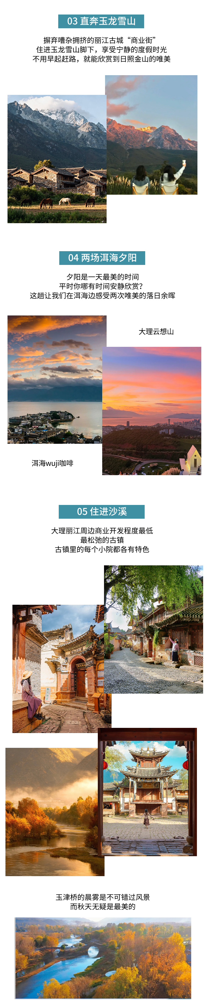 而下午5点以后,我们再去大理本地摄影师私藏的—云想山,绿草坪、蓝洱海、大理城景,全囊括,天气好的时候这里的夕阳也非常的美 不知道你注意到了吗?我们把核心日落点分散在两天,这就是给美景上了“双保险”!就算其中一天天气不好,另一天照样让你拍个够。 晚上,我们住在大理古城,方便你在古城逛累了很快就能回去休息。