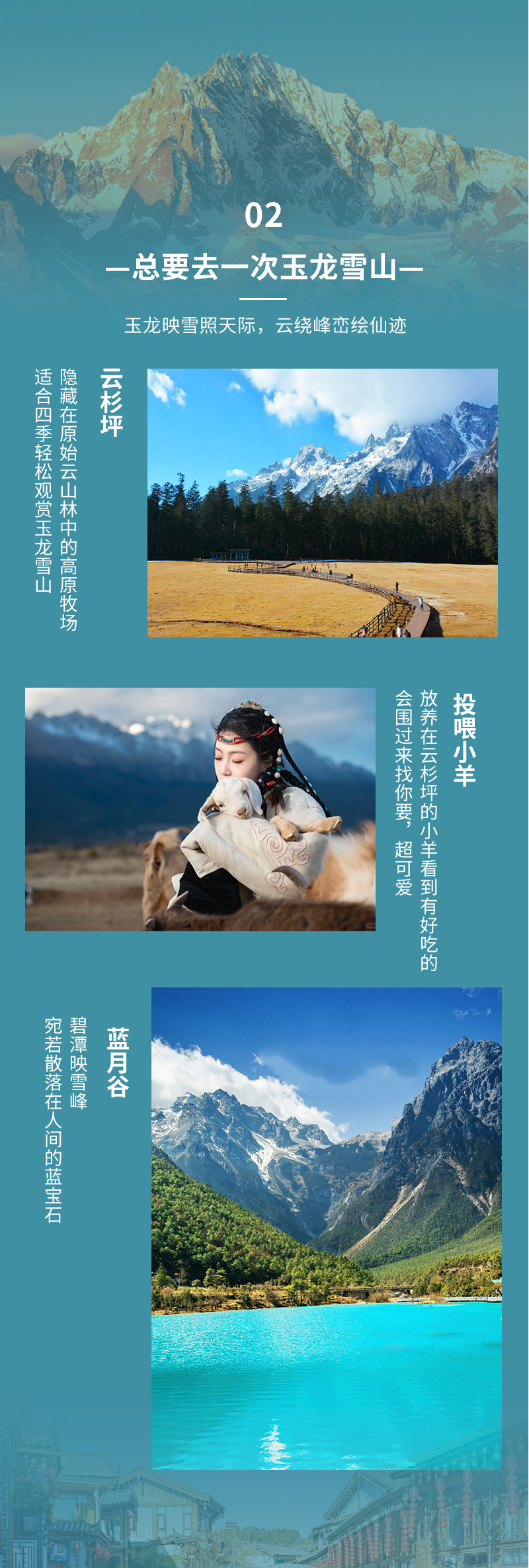 上午,重点要玩【玉龙雪山】!咱们啊,不去主峰凑热闹 ,而是要去海拔最低的【云杉坪】,老人小孩都能轻松逛,雪山、森林、草甸凑一块儿,壁纸级大片随手就有 逛完雪山,咱们避开长长的排队人潮,走小路去蓝月谷,湖水泛着奶蓝色,谁拍谁好看!
