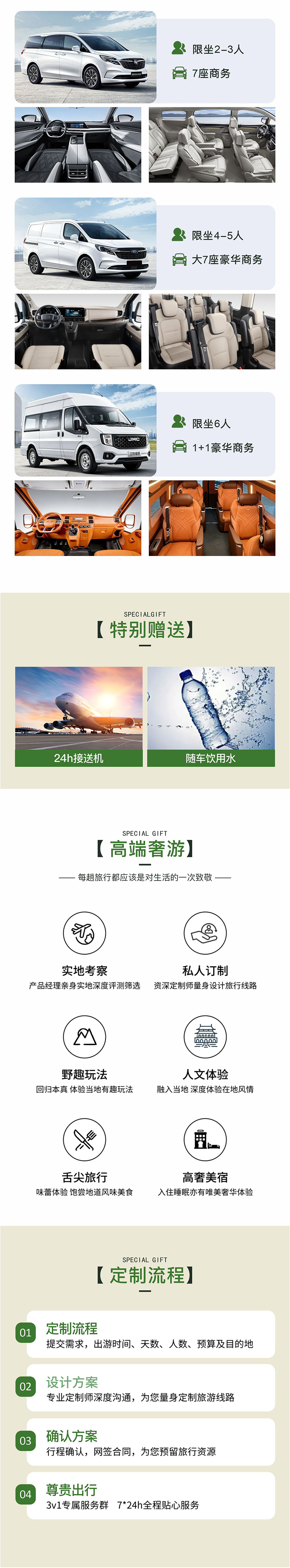 【用车标准】2-3人使用7座商务(参考车型:别克GL8,大通G10/G20);4-5人使用大7座豪华商务(参考车型:福特全顺/海格);6人使用1+1豪华7座商务(参考车型:江铃福顺)。