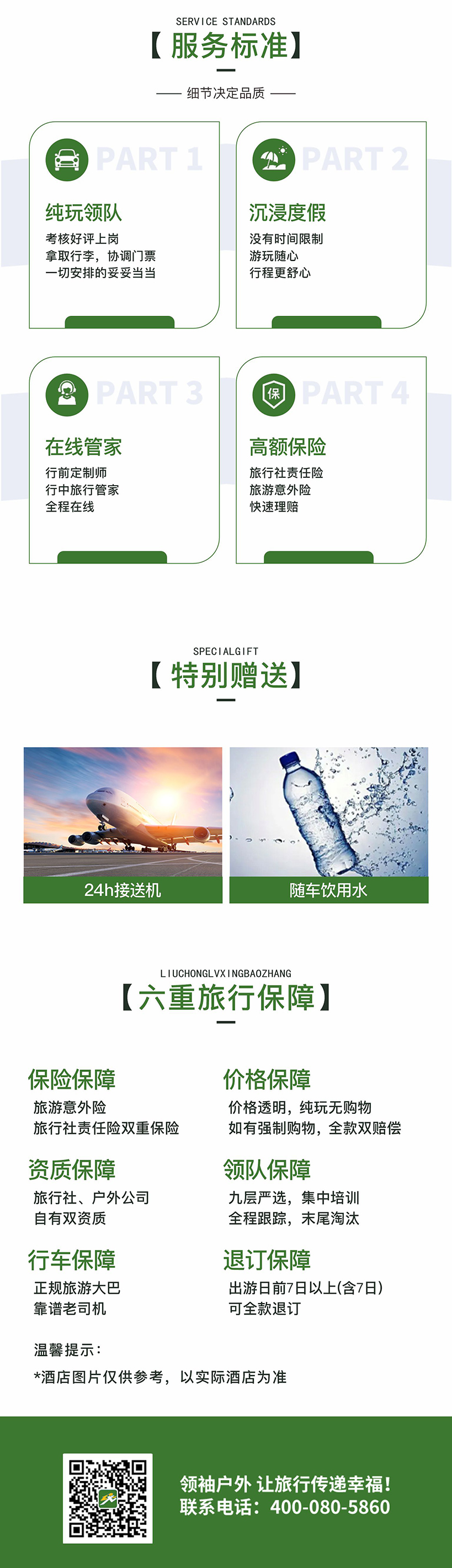 公告:领袖户外的行程安排可能会根据实际突发情况和队员反馈进行调整和优化,但调整不会涉及费用包含的景区、游览天数、集散地点以及住宿标准,最终行程安排以合同内容为准。