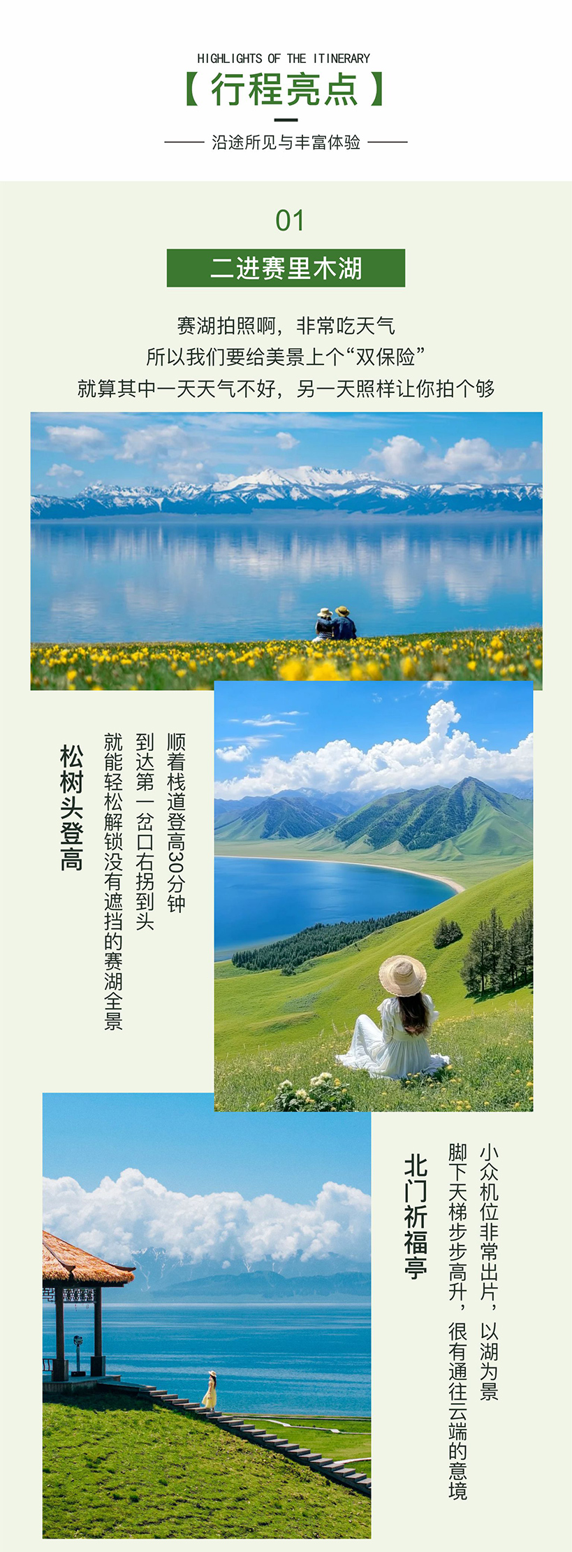 从伊宁出发,直冲赛里木湖,我给姐妹们专门设计能错峰的旅拍动线,咱们顺时针走,这样的好处是——能避开下午松树头到克勒涌珠,最堵的时段,咱们可以错峰慢玩湖西南岸最精华的一段。早上第一站,趁着阳光还不晒,轻徒步30分钟登上松树头,俯瞰赛湖全景,接着是小朋友最爱的帆船游湖,和非常炫酷的人走车跟视频,轻松刷爆朋友圈!在金蟾祈福,坐在石头最高处,仰拍雪山蓝湖悬崖角度,午后到北门祈福亭——这个小众机位,非常的有意境。