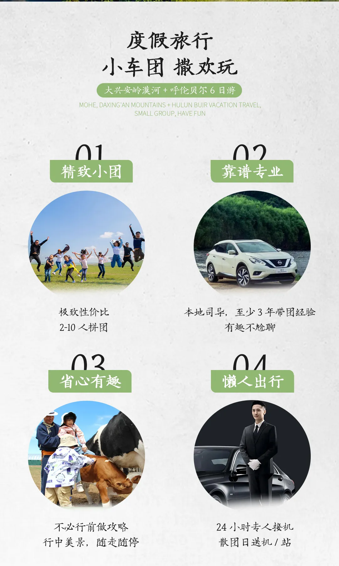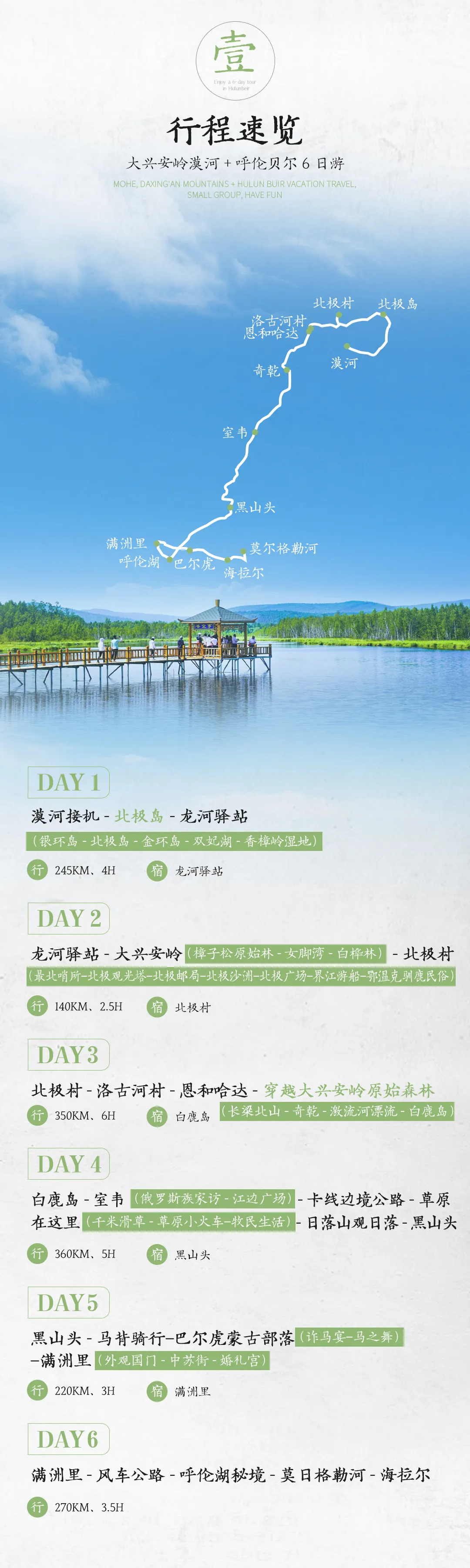 〖出行攻略〗:团期日前3天建出行群,群内发出团通知,团期当日全天集合12.30在北极村北极星广场集合,司机会在前一天20.00再次通知您的。赠送接机服务,接机日前1天以短信联系您说明次日接机事宜,接机人员在飞机落地时联系您,落地请开手机! 散团时间约为第六日17:00,建议您选择购买19.00以后的飞机或火车回程。