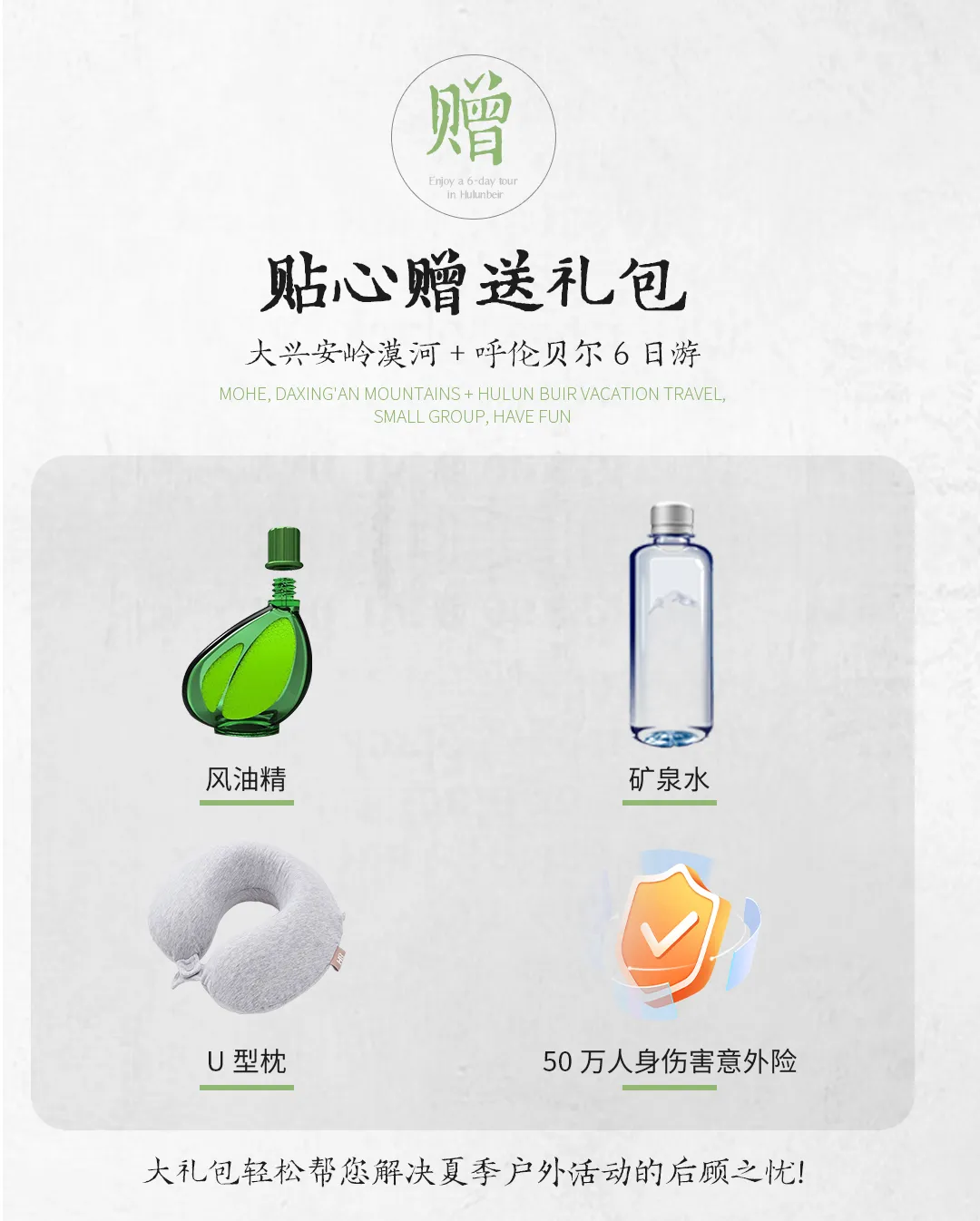 Ⅱ.【物品】由于夏季呼伦贝尔地区紫外线强、地表温度高,您需要提前购买50倍防晒霜与夏凉帽,防止晒伤、黑或中暑。